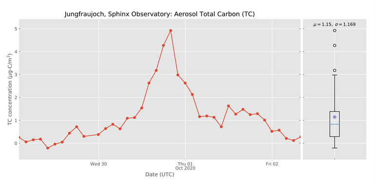 Die Luft im Sphix-Observatorium auf dem Jungfraujoch auf 3’580 Metern ü.M. ist meist sehr sauber. Doch am 30. September 2020 messen die Sensoren einen ungewöhnlichen Anstieg von kohlenstoffhaltigen Aerosolen. Dieser Aerosoltyp stammt meist aus Verbrennungsprozessen wie sie zum Beispiel in Dieselmotoren stattfinden. Der ungewöhnliche Anstieg geht aber auf ein anderes Phänomen zurück: «Alles deutet darauf hin, dass diese Emissionen von den Waldbränden in Kalifornien herrühren», sagt Dr. Alejandro Keller.
