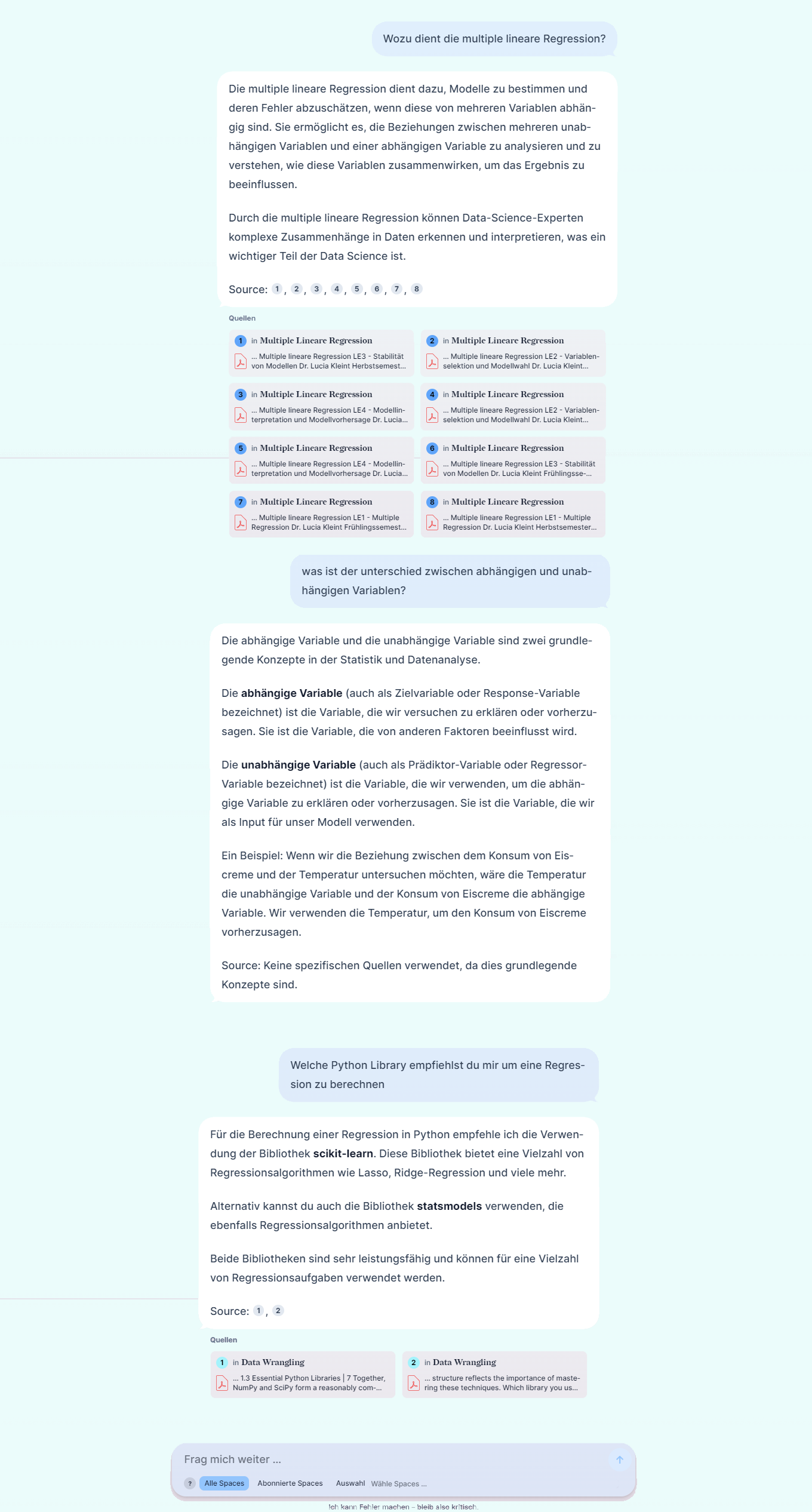 Wie andere Chatbots auch kann der KI-Tutor Fehler machen und falsche Antworten liefern. Die Studierenden sollten daher die vom KI-Tutor gegebenen Antworten kritisch hinterfragen. Besonders hilfreich ist dabei die Quellenangabe: Der KI-Tutor verlinkt zu jedem generierten Text die verwendeten Dokumente, sodass die Studierenden die Informationen leicht überprüfen und sich weiter in die Materie einarbeiten können.