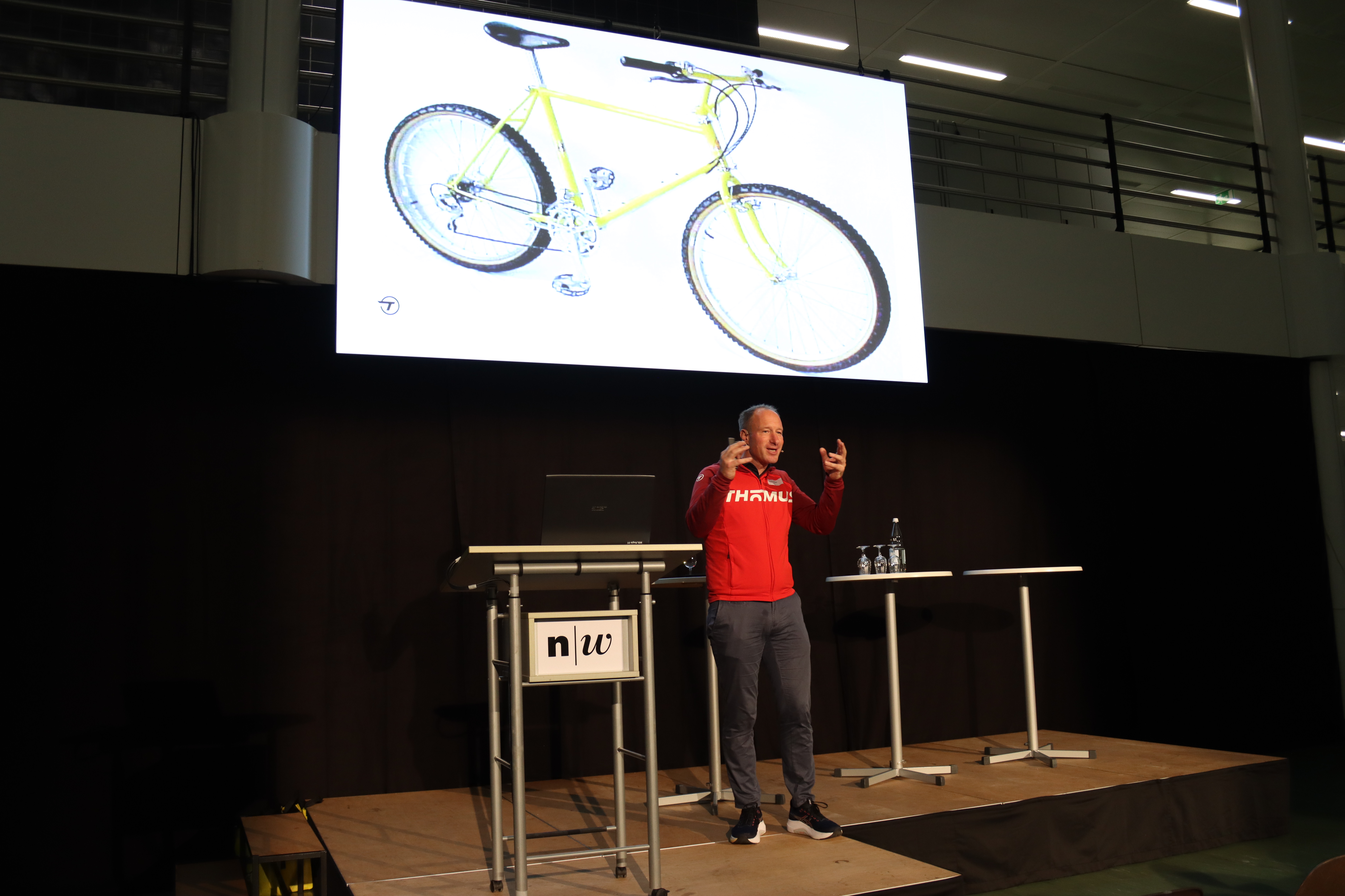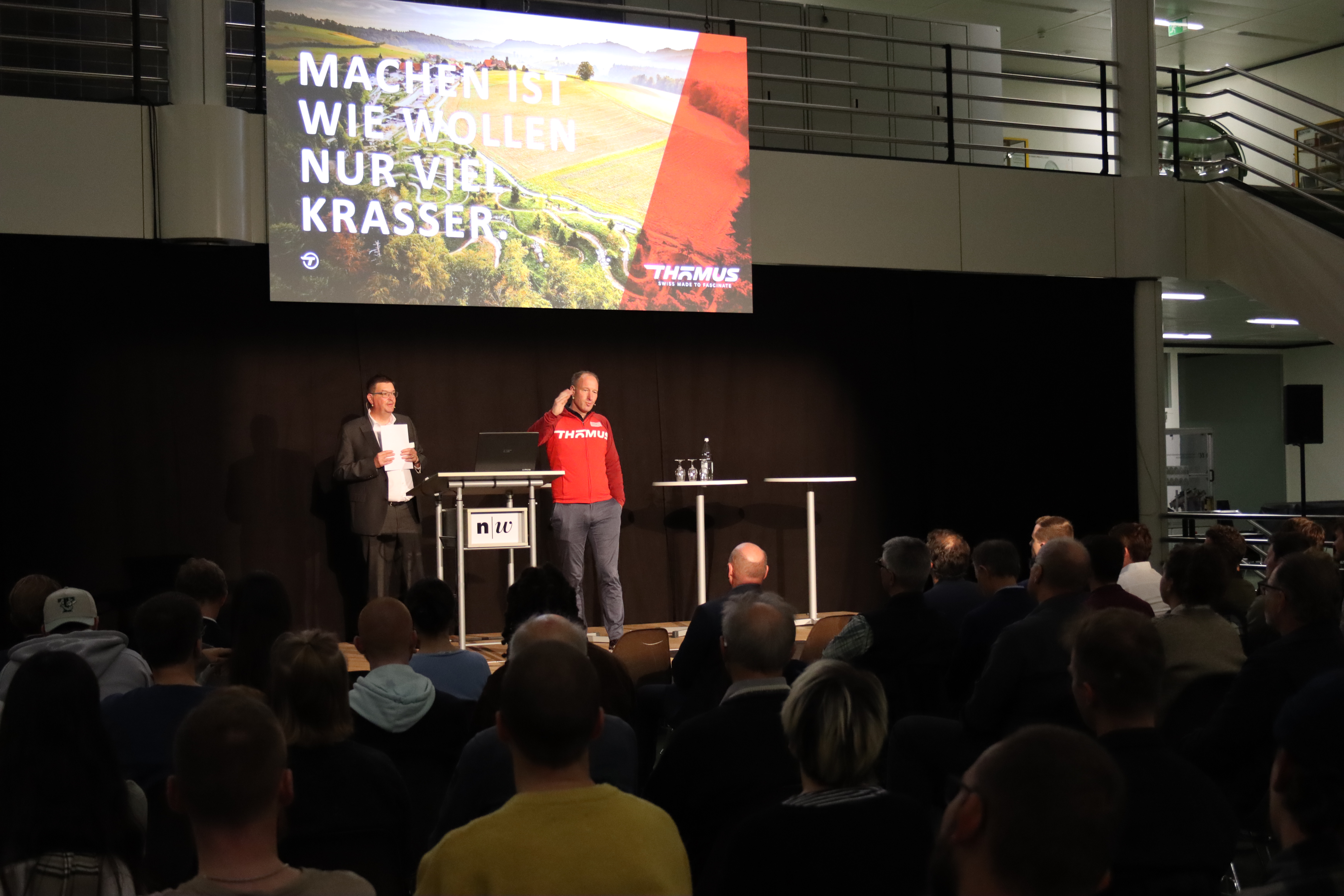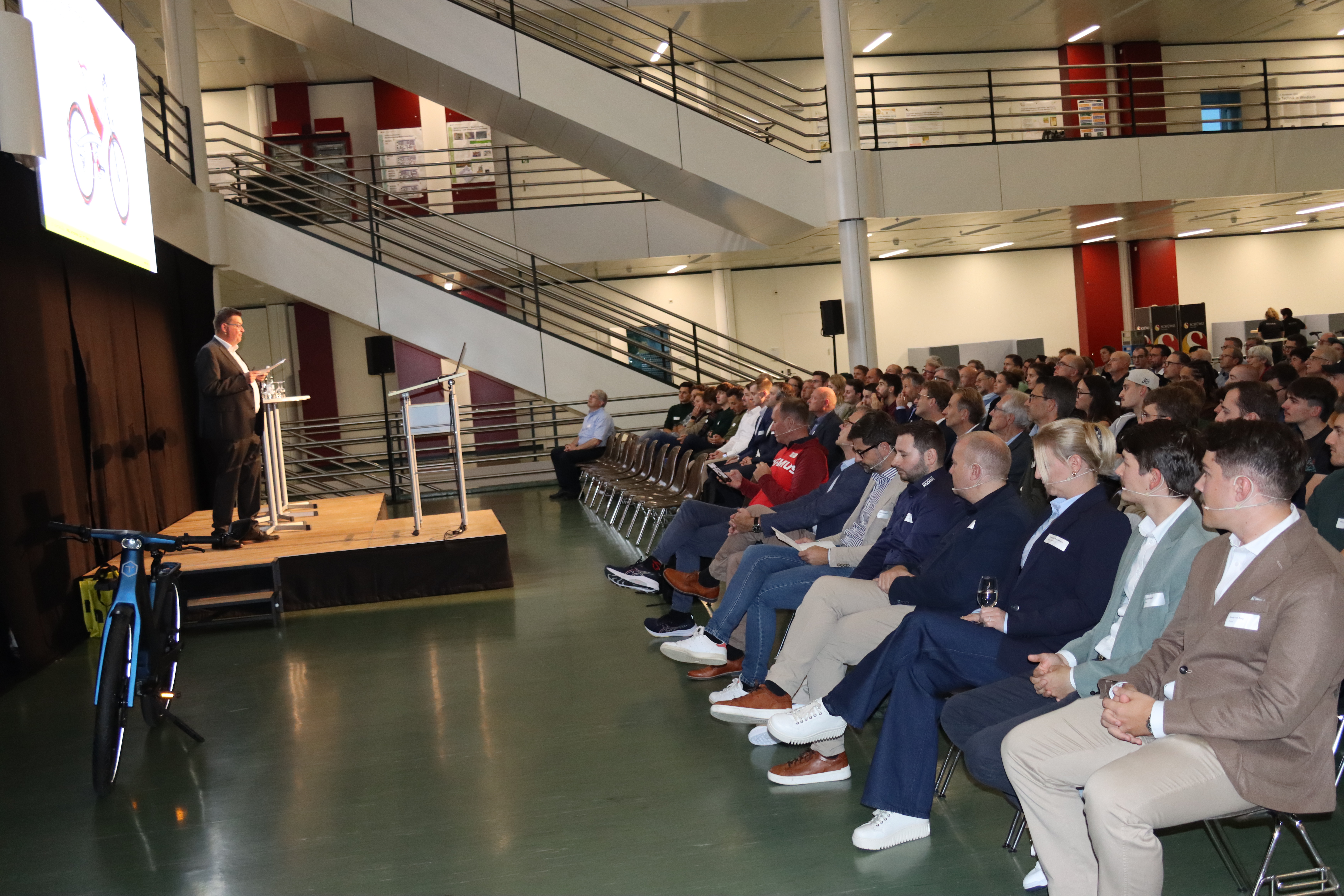 Zu Beginn präsentierte Thomas Binggeli, Gründer und CEO von Thömus Bikes, Beispiele dafür, wie Schweizer Unternehmen durch technologische Entwicklung und Unternehmergeist Impulse für die Mobilität setzen. Anhand des Hightech-Velos Twinner zeigte er, wie Digitalisierung, Materialtechnologie und Systemintegration die Weiterentwicklung von Zweiradkonzepten prägen. Er erläuterte, dass das Velo zunehmend als Teil integrierter Verkehrslösungen betrachtet wird – sowohl im urbanen Raum als auch in der Tourismus- und Sportbranche. Nach dem Referat nutzten zahlreiche Gäste die Möglichkeit, das Twinner-Bike im Rahmen von Testfahrten unmittelbar vor Ort zu erleben.