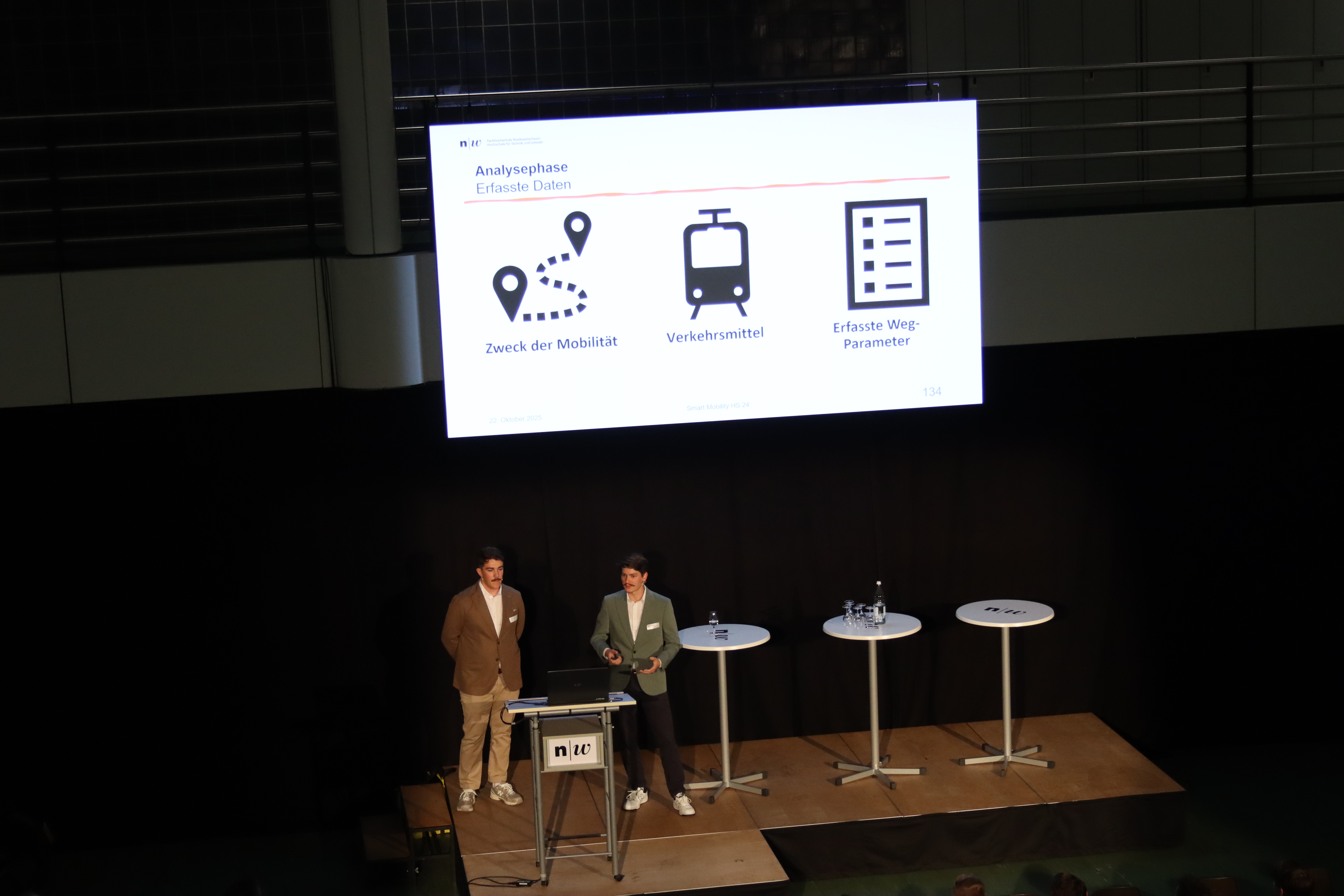Im zweiten Programmteil stellten die WIng-Studierenden Benjamin Blanke und Jonas von Burg ihr Projekt «Smart Mobility Connect» vor. Die Arbeit entstand im Rahmen des Moduls Smart Mobility und basiert auf der Analyse realer Mobilitätsdaten. Ziel des Projekts war die Entwicklung einer multimodalen Mobilitätsplattform, welche Car-Sharing und regionale Verkehrsdienstleistungen verbindet. Die Studierenden erklärten, dass vor allem Nutzerfreundlichkeit, Effizienz und Flexibilität entscheidend dafür seien, wie Menschen Verkehrsmittel kombinieren und Mobilitätsentscheidungen treffen. Das Beispiel zeigte exemplarisch, wie Studierende am Standort Brugg-Windisch praxisorientierte Herausforderungen bearbeiten.