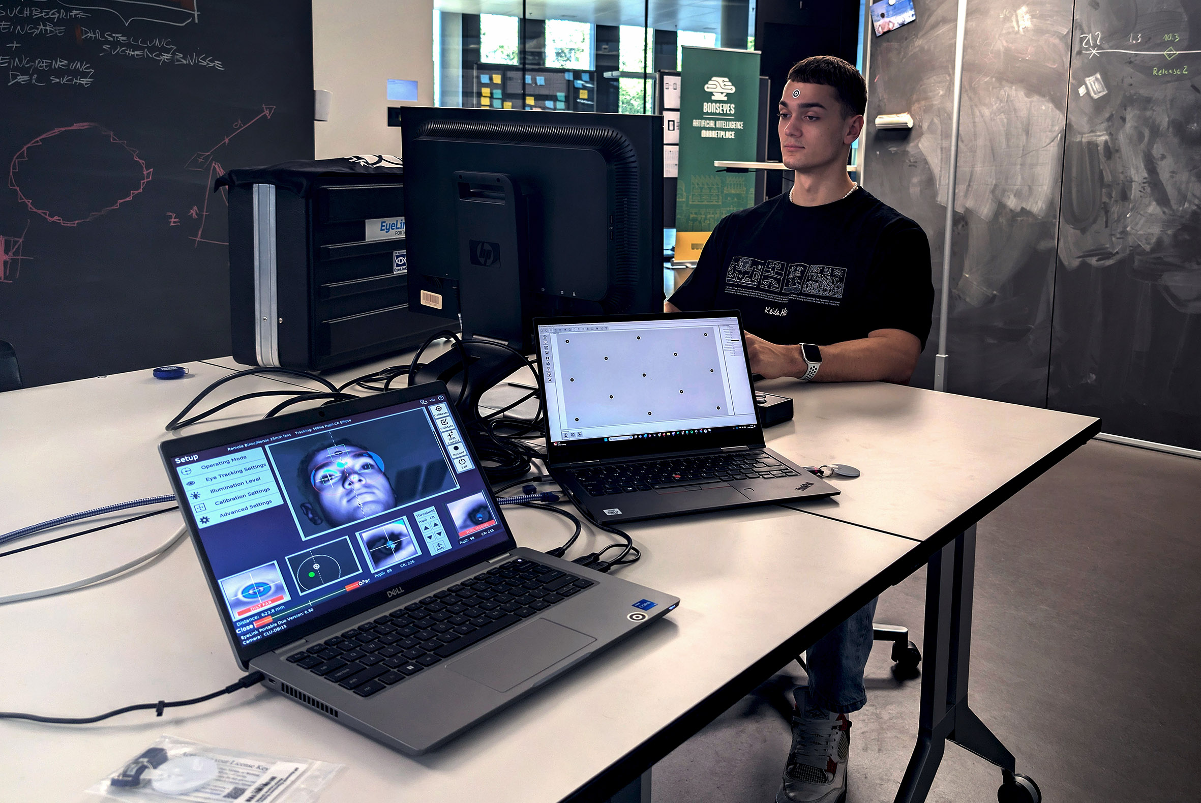Kalibrierung des EyeLink Eye-Trackers. Ermöglicht die Erfassung von Augenbewegungen, Blinkrate und Pupillenveränderungen. Unterstützt die Optimierung der Benutzerfreundlichkeit von Anwendungen.