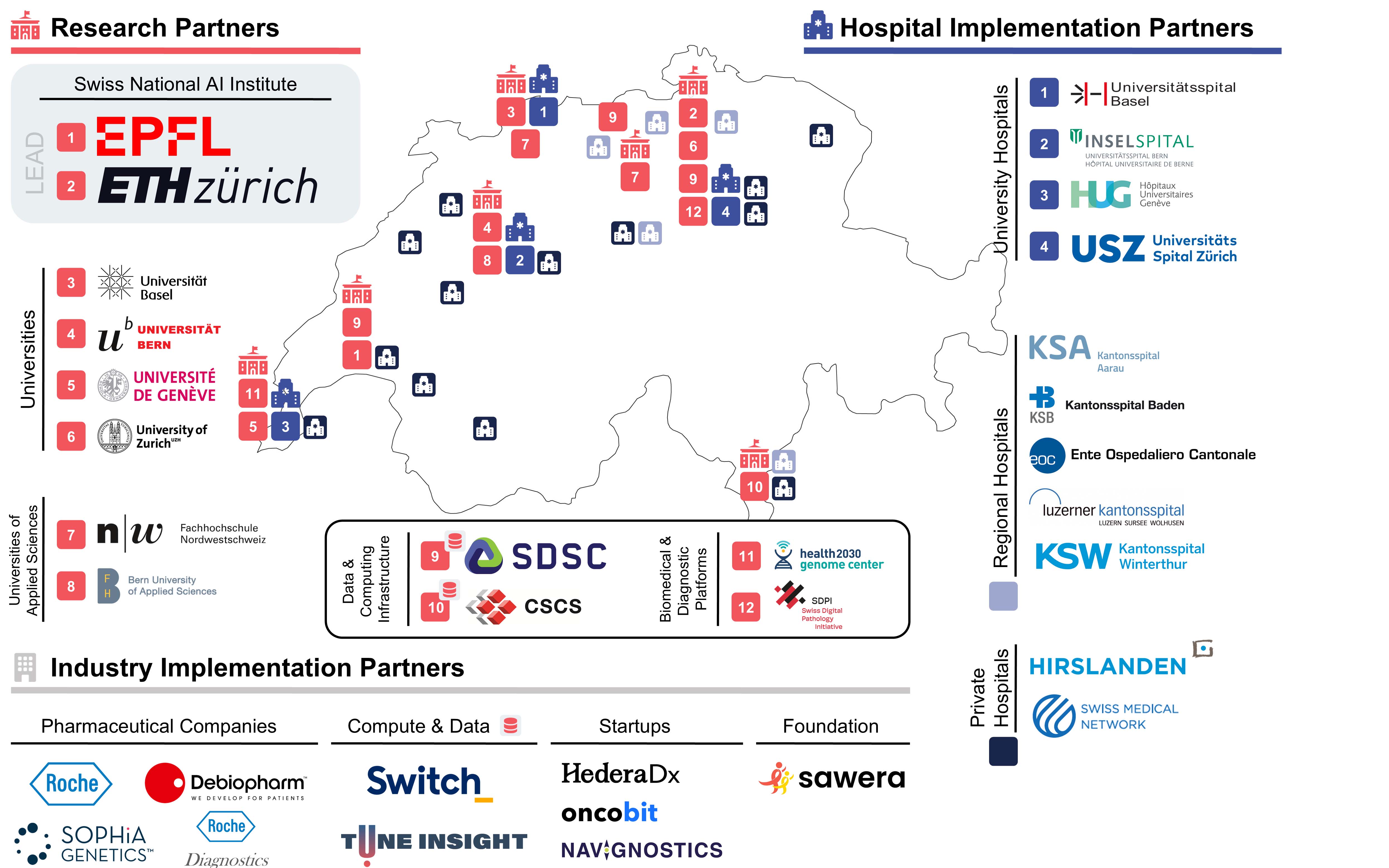 NAIPO wird über einen Zeitraum von vier Jahren umgesetzt und ist mit einem transdisziplinären Team führender Schweizer Institutionen, die an der Forschung und Umsetzung arbeiten – die grösste landesweite Initiative dieser Art. Sie wird vom EPFL AI Center in Zusammenarbeit mit dem ETH AI Center, dem Swiss Data Science Center (SDSC), der Hochschule für Life Sciences FHNW und der Hochschule für Informatik FHNW der Fachhochschule Nordwestschweiz, der Fachhochschule Bern, den Universitätskliniken Basel, Bern, Genf und Zürich, regionalen und privaten Kliniken, Roche, SOPHIA GENETICS, Switch und Tune Insight als wichtigste Akteure geleitet.