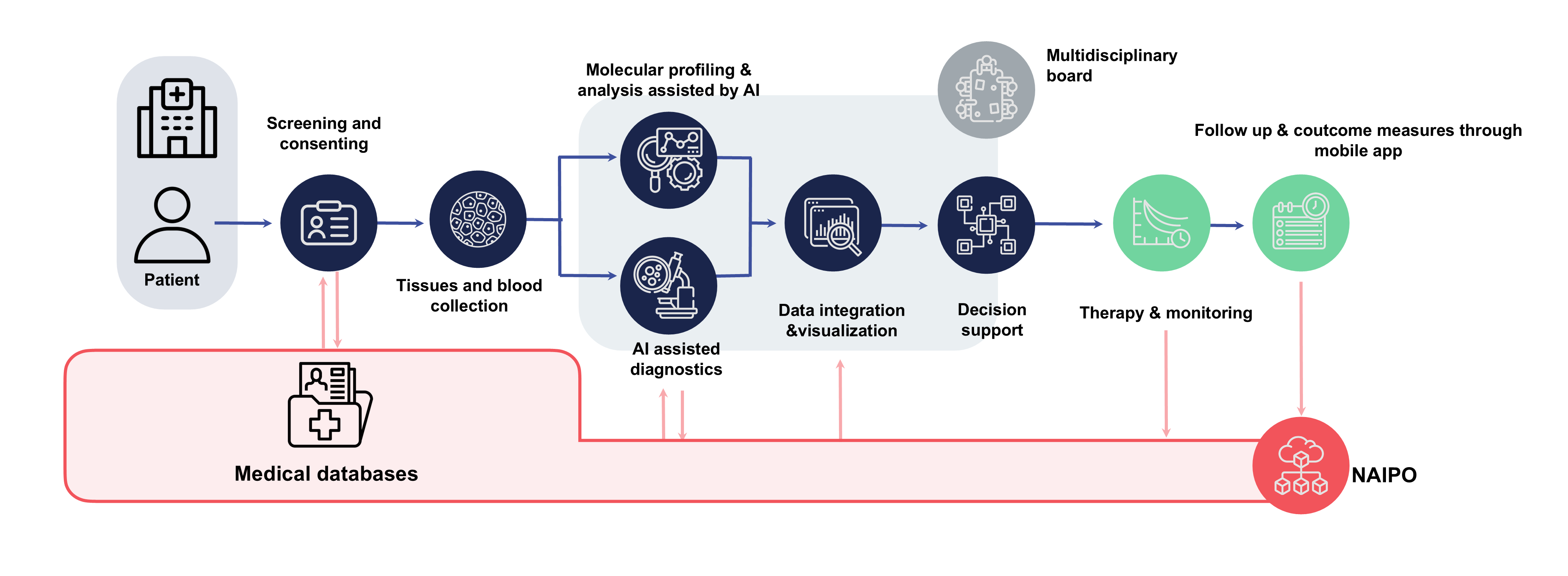 NAIPO entwickelt eine digitale Plattform, die Ärztinnen und Ärzte mit Hilfe von KI bei Diagnose und Therapieentscheidungen unterstützt. Sie soll die personalisierte Behandlung von Krebspatientinnen und -patienten verbessern, Ungleichheiten zu deren Zugang verringern und die Entdeckung neuer Biomarker und Therapien beschleunigen. Grundlage dafür ist ein sogenanntes föderiertes Lernsystem – eine Technologie, die es erlaubt, Daten aus verschiedenen Spitälern zu nutzen, ohne sie zentral zu speichern. So bleibt der Datenschutz gewahrt.