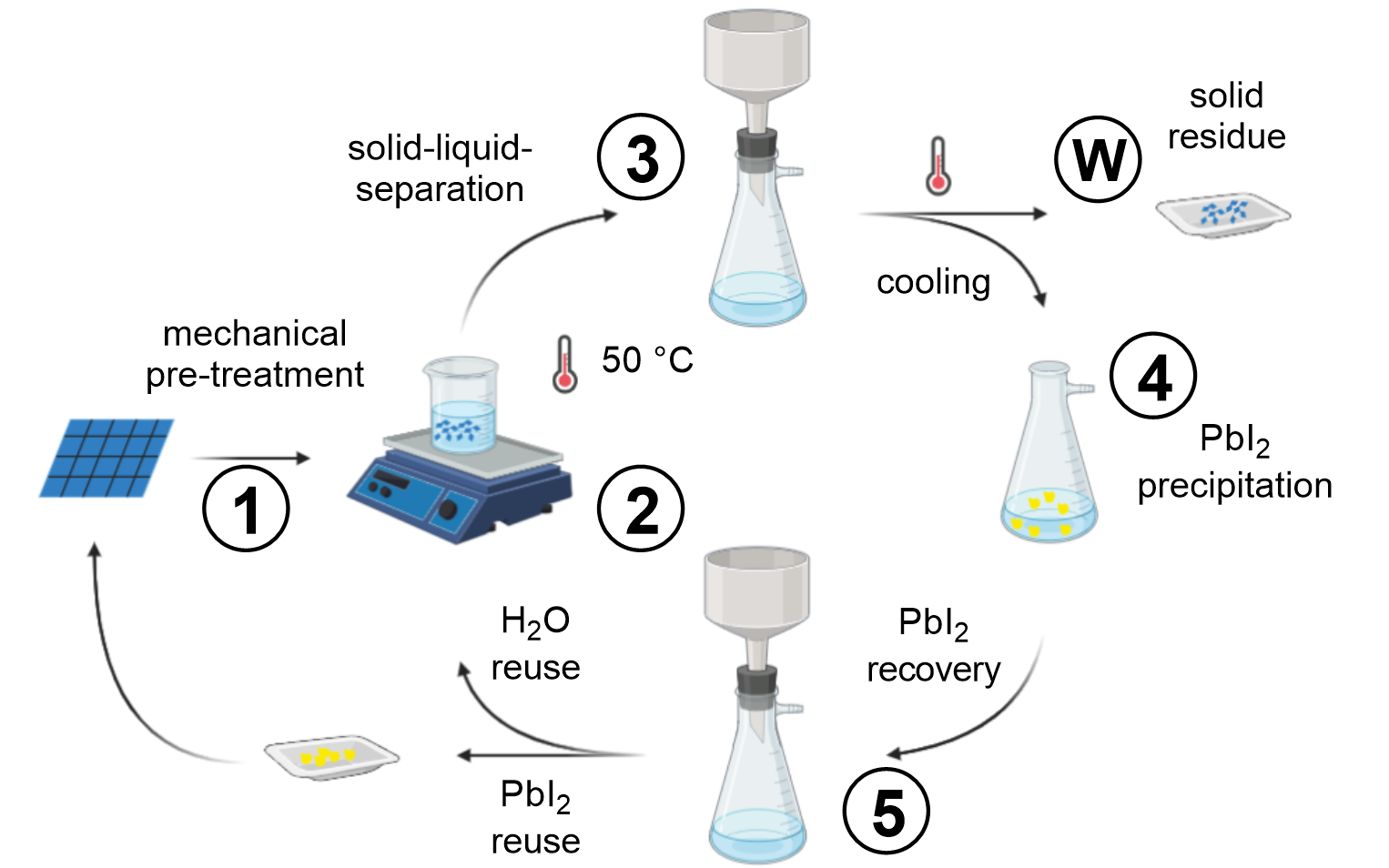 Perovskit-Zellen können aber Blei (Pb) enthalten, weshalb speziell dem Recycling am Ende der Lebenszeit eine Bedeutung zukommt. Bislang beruhte das Pb-Recycling meist auf der selektiven Auflösung in organischen Lösungsmitteln.