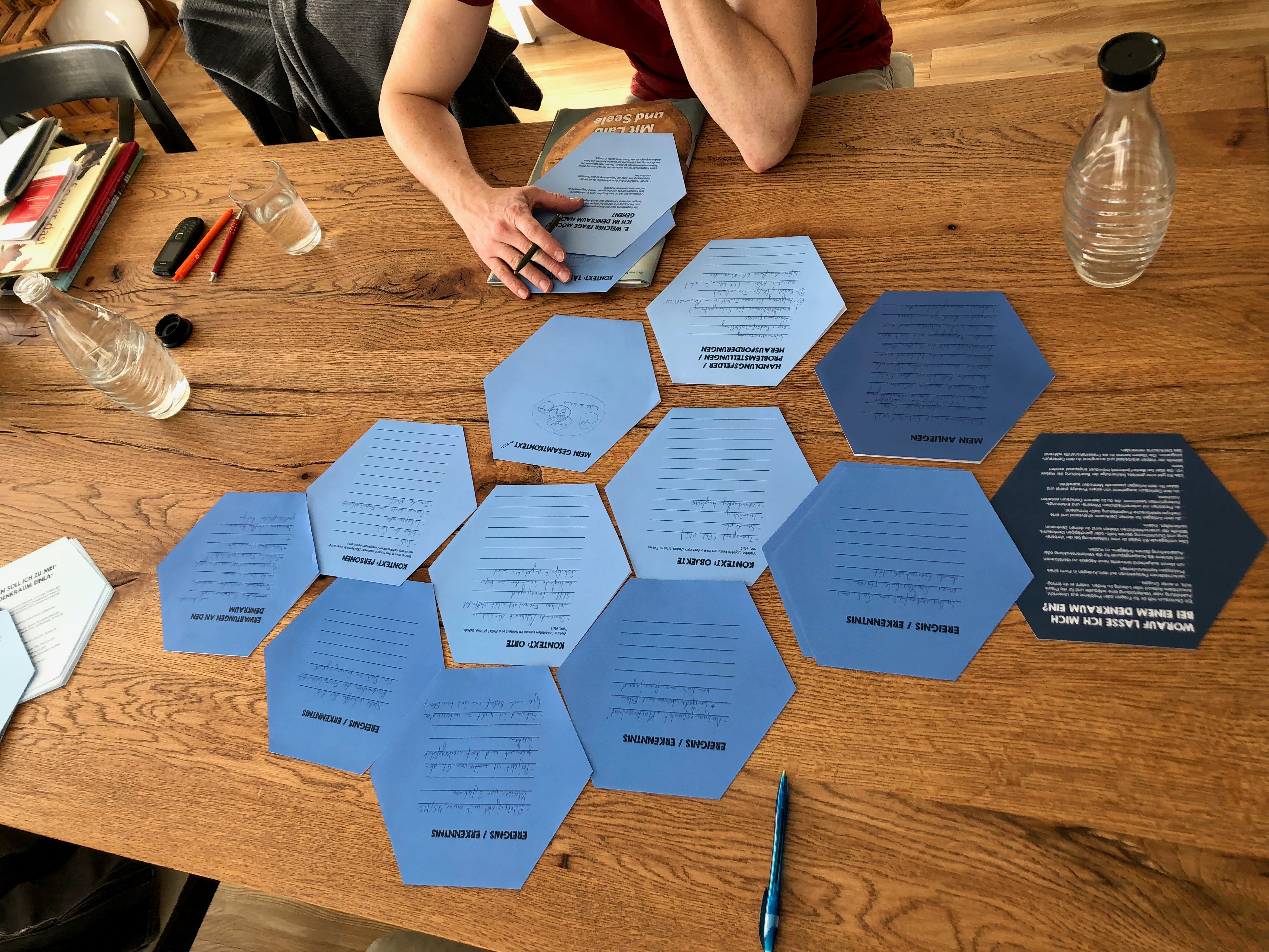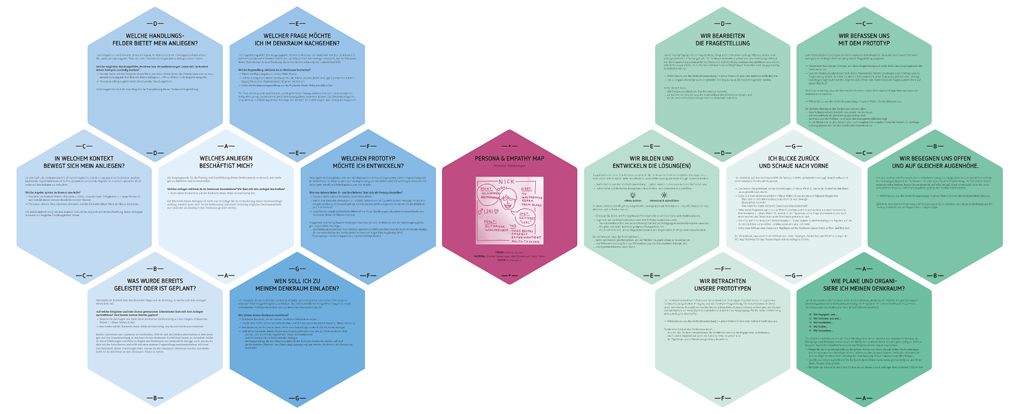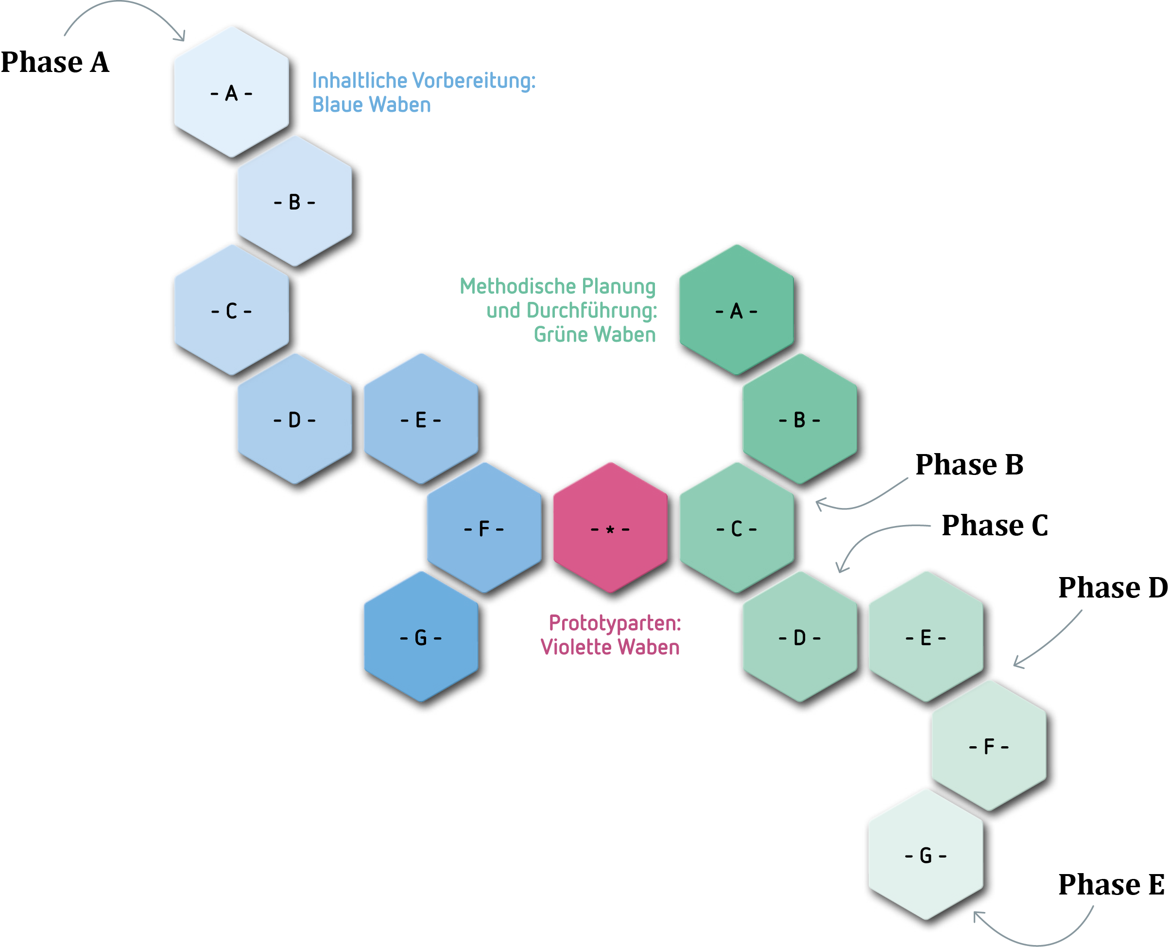 Diese Denkraumphasen sind im Denkraum-Kit in einzelne Schritte – in Form von verschiedenen Waben – übersetzt (blaue und grüne Waben A-G).