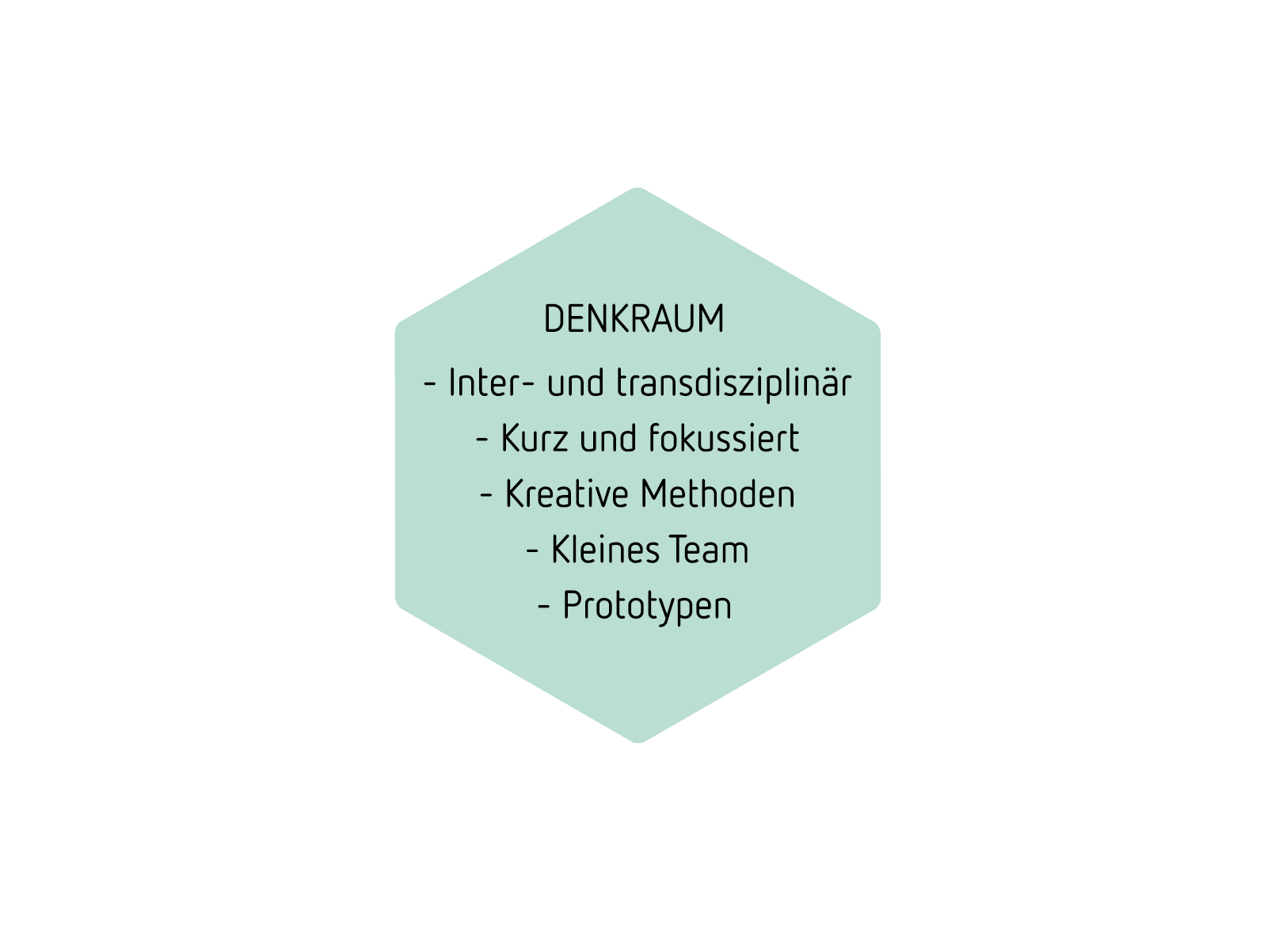 Der phasengeleitete Ablauf, die zur Verfügung stehenden Methoden, der Einsatz von Prototypen sowie die Denkraumregeln sind darauf ausgelegt, den erforderlichen inter- und transdisziplinären Austausch systematisch und fokussiert innerhalb eines Halbtages zu ermöglichen. Das Format Denkraum kann zudem auch individuell auf jegliche längere Zeitdauer ausgeweitet werden.
