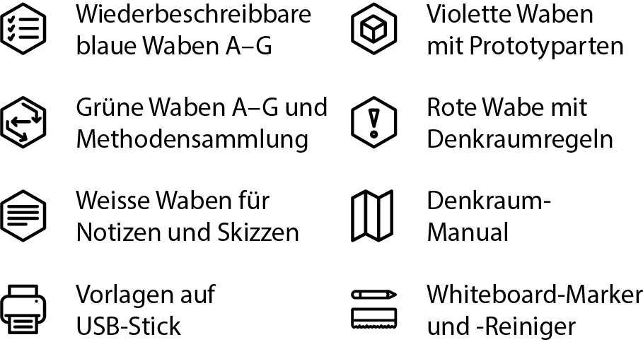 Ein Denkraum-Block umfasst alle Waben des Denkraum-Kits. Die beschreibbaren Papier-Blocks stellen eine praktische Alternative zum umfassenden Denkraum-Kit dar.