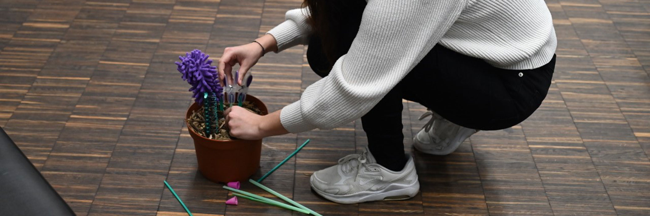 Im Rahmen der Nachhaltigkeitswoche stellte Andrina Jörg, Künstlerin und Mitarbeiterin der Professur Kulturvermittlung und Theaterpädagogik am 6. März 2024 ihr Kunst- und Vermittlungsprojekt Paranatur Forschungslabor vor. Bilder von Kunststoffobjekten, die in die Natur verpflanzt wurden, erweckten bei Betrachtenden Assoziation von echten Pflanzen und generierten auf diese Weise Fragen hinsichtlich des Umgangs mit Konsum und Natur.