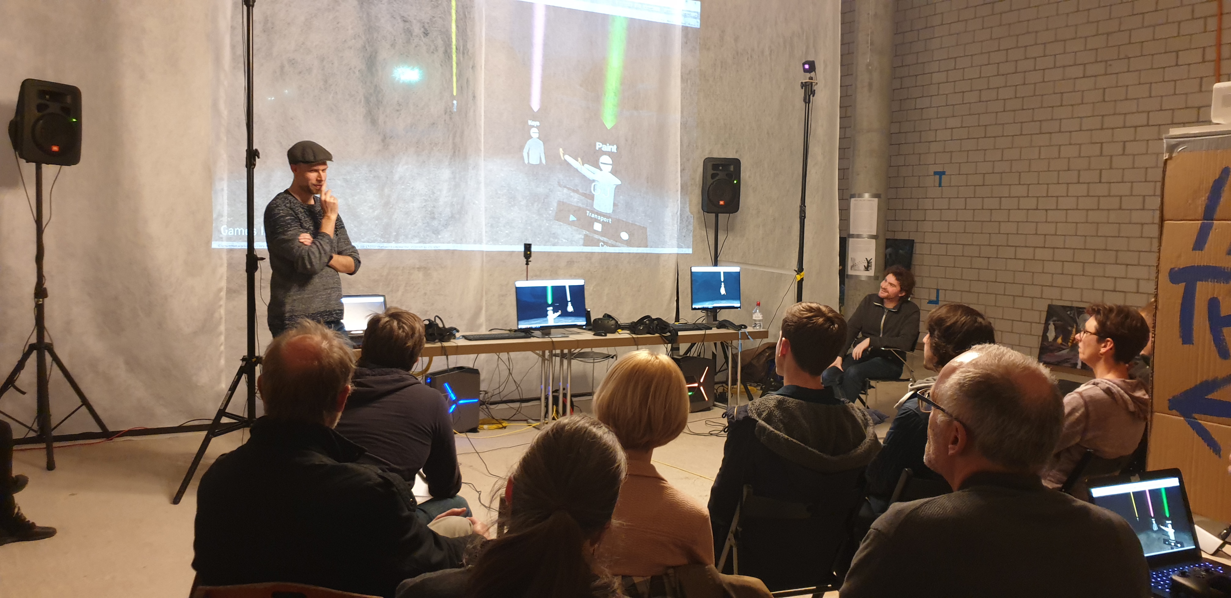 Das Forschertrio stellte sich am Beginn der mehrere Jahre umfassenden Arbeit die Frage, wie man in gameartiger Umgebung Musik machen kann und in welcher Form dies mit spezifischen Spielmechaniken verbunden werden kann. Wie ist es möglich, in einer virtuellen Realität, gemeinsam künstlerisch, musikalisch tätig zu sein? Dieser „Glücksfall“, mittels SNF-Finanzierung künstlerisch forschen zu dürfen, führte zur Entwicklung einer Multi-User-VR-Umgebung sowie von drei virtuellen Instrumenten; eine Welt, die „visuell zum Klang passt“, die zur „Theaterbühne“ wird und auf Basis vielfältiger Optionen mit den drei Grundobjekten, die jeweils ihre eigene „Klang-DNA“ besitzen, bespielt und ausgestattet wird. Lervik, Pfaff und Spoerri verstehen sich als „Instrumentenbauer“ nicht-konventioneller-Instrumente. Die Entscheidung, dass der digitalen Instrumenten-Welt keine konkreten Formen aus der Echt-Welt zugrunde liegen sollen, war eine bewusste. Hingegen fielen andere ästhetische Entscheidungen wie Farben, Sounds oder Formen, durchaus auch „zufällig“, was für einen künstlerischen Arbeitsprozess auch charakteristisch ist. Wesentlich war schliesslich, so die Protagonisten des Abends, eine Programmiersprache für den Klang zu entwickeln und damit verbunden wenige Parameter für einen Klang zu bestimmen, damit eine Übersichtlichkeit und Einfachheit gegeben ist. Es sei beinahe eine Art „Rückbewegung an die Quellen der Musik“, wird von ihnen erklärt, insofern die Bedeutung der Klangfarbe als musikalisches Element absolut in den Vordergrund rücke. Dieses System setzt letztlich an Interaktionsweisen und Spielmechaniken der Gamewelt an, aber transformiert diese Spielweisen in Richtung „kammermusikalisches“ Zusammenspiel. Das musikalische Tun innerhalb dieser vollkommen neuen Situation, die – im Gegensatz zur realen Welt des gemeinsamen Musizierens – Erwartungen und Grundlagen für die Interaktion wie Augenkontakt, Zusammenatmen oder Haptik – vermissen lässt, muss erst einmal geübt werden. Andererseits bietet die virtuelle Realität neue Möglichkeiten, beispielsweise, „Schwächen“ aus der realen Welt ausgleichen. Die „Gartenmetapher“, die in der virtuellen Realität hier so anschaulich wurde, schafft – so in der abschliessenden Diskussion gemeinsam erörtert – letztlich auch einen pädagogischen Zugang auf der Metaebene, die über das konkrete Erlebnis in der virtuellen Welt hinausgeht: die Idee, Musik zu „bauen“ und in dieser Klanglandschaft auf Entdeckungsreisen zu gehen. Wer die virtuelle Welt selbst ausprobieren möchte, ist von den Projektleitern eingeladen, in Zürich die Brille aufzusetzen.