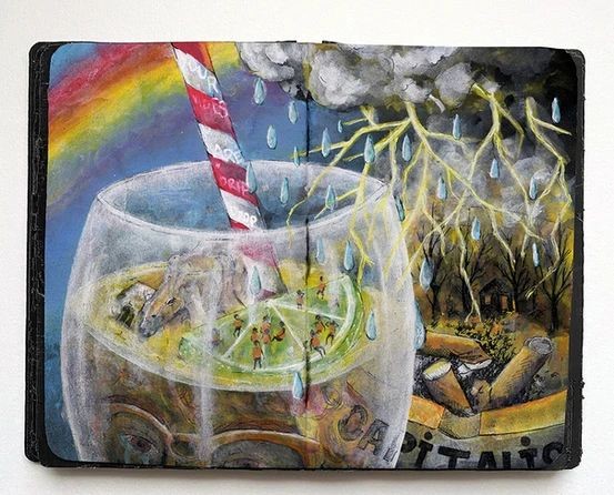 In meiner Arbeit beschäftige ich mich mit den Ursprüngen des Weltschmerzempfindens meiner Generation und dem Gefühl des machtlos Seins gegenüber all den Großkonzernen und Ländern, die das Klima zerstören, die Ressourcen der Erde ausbeuten, die Menschen ausbeuten, die massenhaft Tiere ermorden, die Meere überfischen, die Gewässer mit toxischen Abfällen vergiften, die Kriege unterstützen nur für Macht und Geld und Flüchtende nicht aufnehmen, sondern einfach sterben lassen.