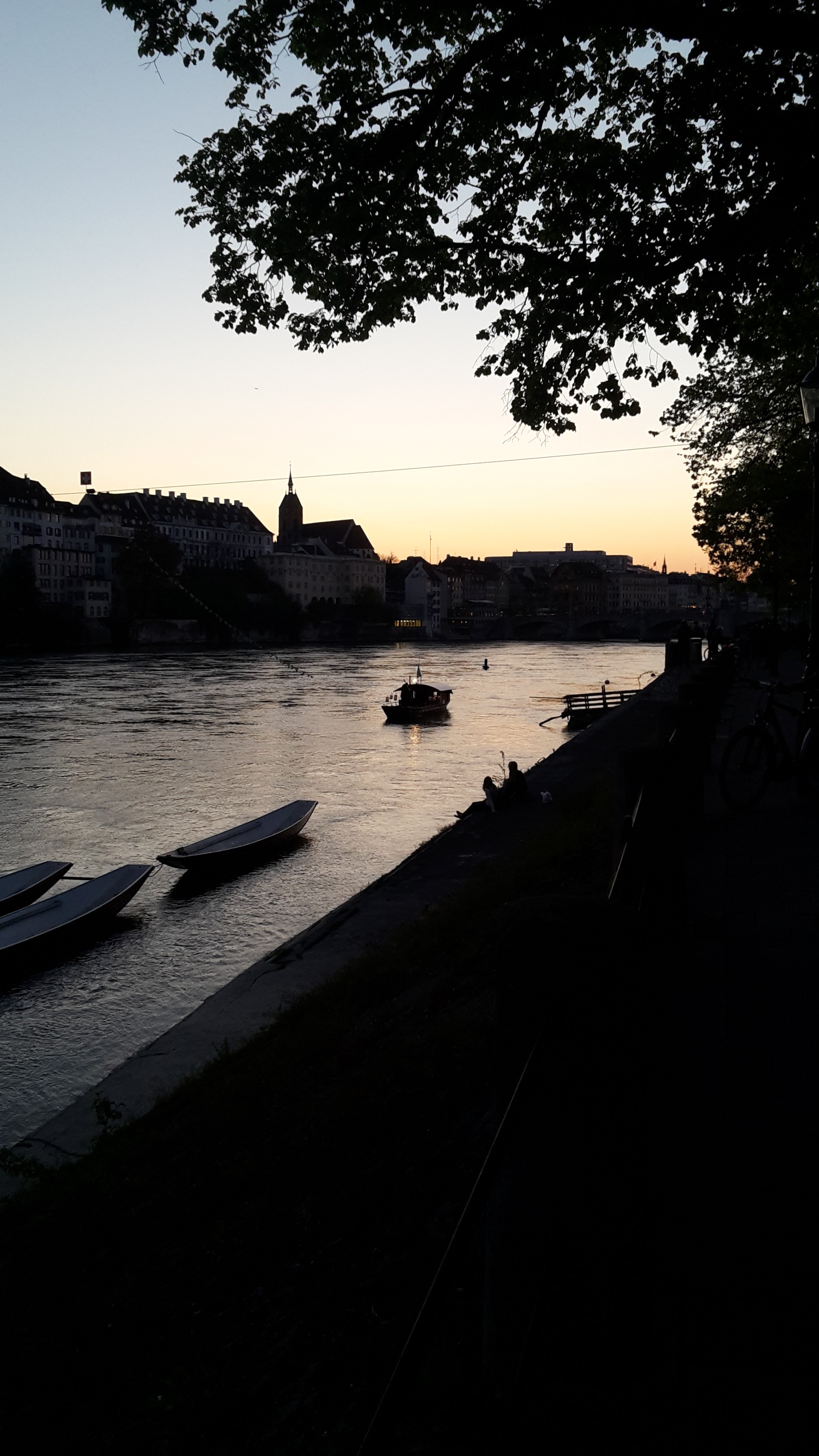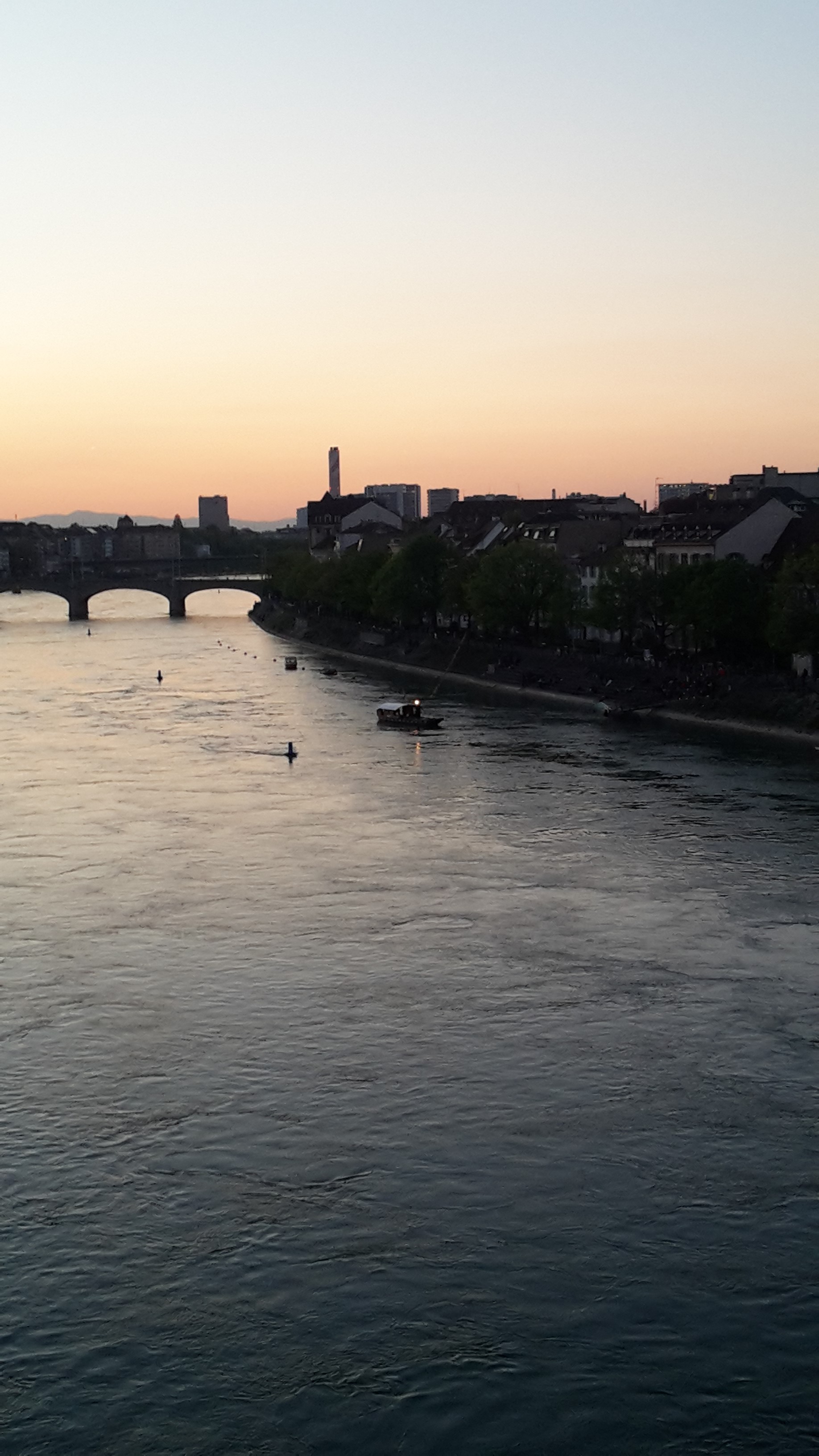 Das Konzert am Donnerstag 23.04.2015 der Veranstaltungsreihe „Musik und Mensch“, die dieses Jahr unter dem Motto „über_setzen“ steht, war etwas ganz Besonderes. Anstatt sich in einem der üblichen Konzertlokalitäten der Stadt Basel zu versammeln, fanden sich die Zuhörerinnen und Zuhörer am Fusse des Münsters an der Anlegestelle der Münsterfähre ein. Um dem Konzert beizuwohnen, mussten sie zunächst auf die andere Seite des Rheins übersetzen. Auf diese Weise nahmen sie für einen Moment sogar den Platz auf der späteren Konzertbühne ein und wurden so gleichsam eingeladen, selbst Übersetzungsarbeit zu leisten, zumindest innerlich ihre ganz persönliche Musik des Abends zu hören. Vor dem Hintergrund der spektakulären Rhein-Altstadtkulisse, umgeben von Wind, Wasser und dem bezaubernden Himmel, wurden alle Sinne stimuliert und bereitet für Mich Gerbers sich anschliessende Über_setzung dieser blauen Stunde.