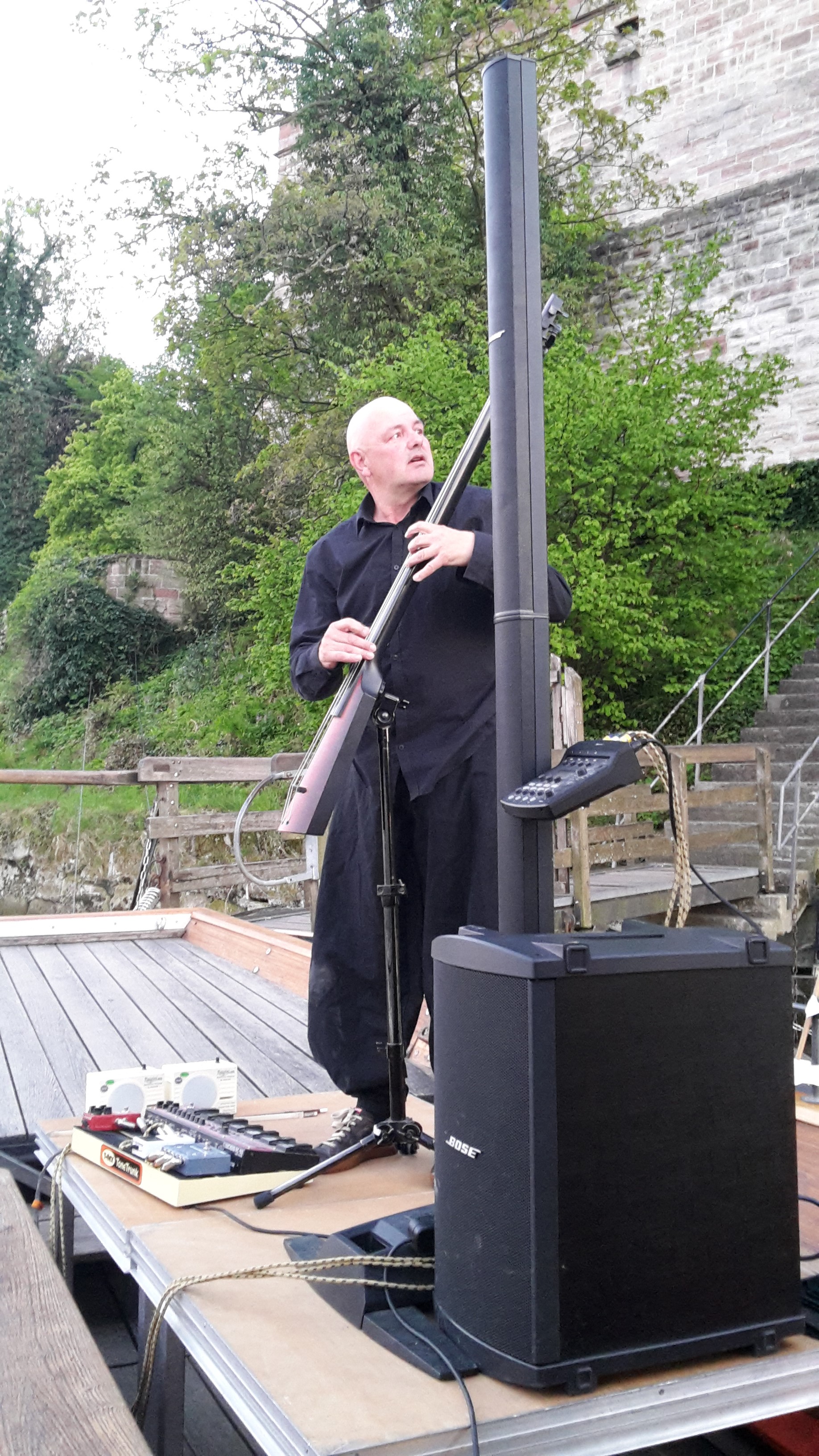 Mich Gerber aber gelang es mit seinem Bass und Live-Samplinglayers Klang-Flusslandschaften unterschiedlichster Zeiten und Regionen der Welt zu evozieren. Mal glaubte ich mittelalterliche Klänge des nahen Münsters zu vernehmen, mal fühlte ich mich an einen Urlaub in Istanbul erinnert, selbst das Übersetzen zum Hades kam mir bei einer seiner Improvisationen in den Sinn. Meistenteils ging es aber in diesem rauschenden Konzert sehr lebendig und fröhlich zu und mit einem Glas Wein stand der pure sinnliche Genuss im Vordergrund.