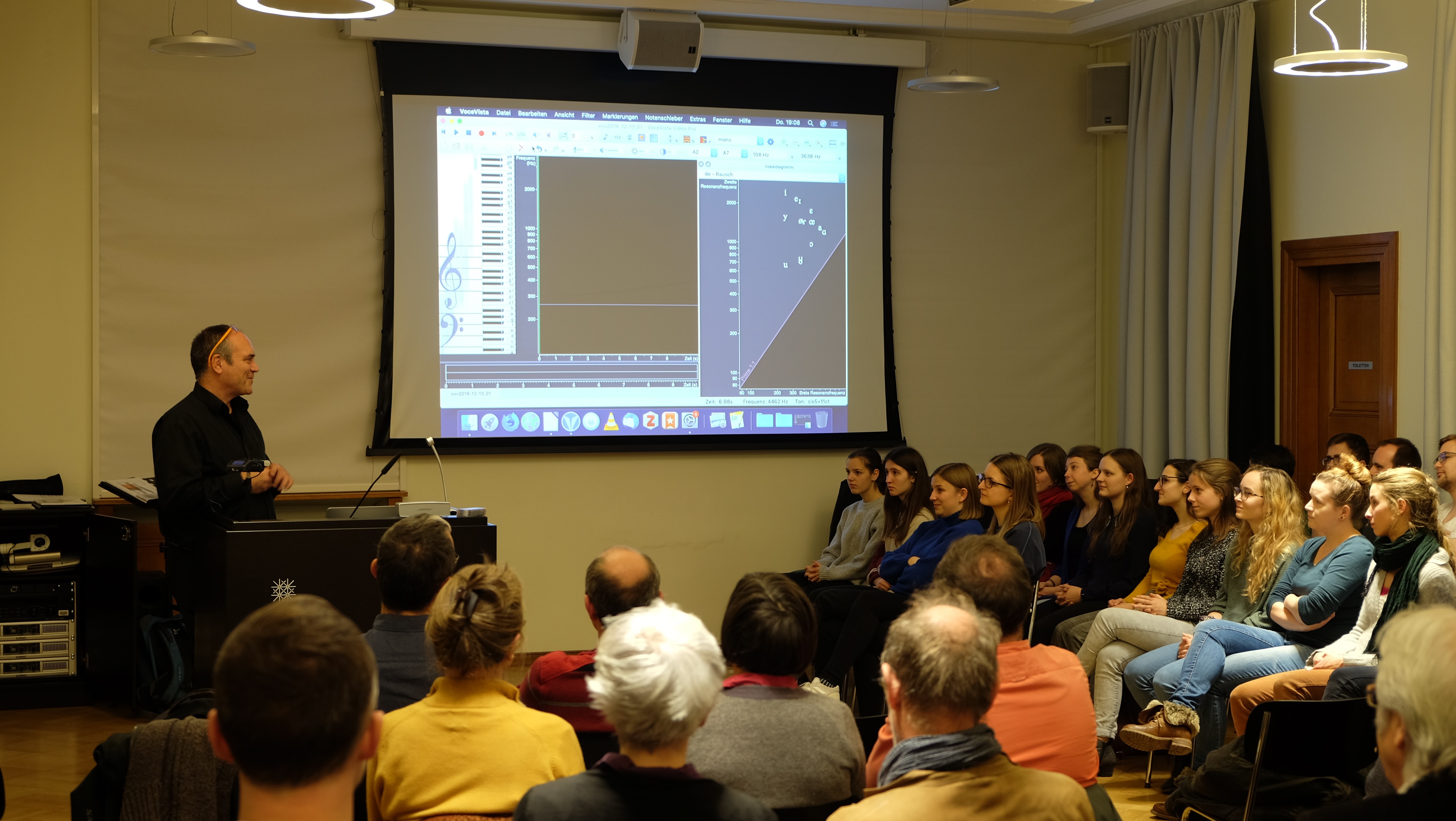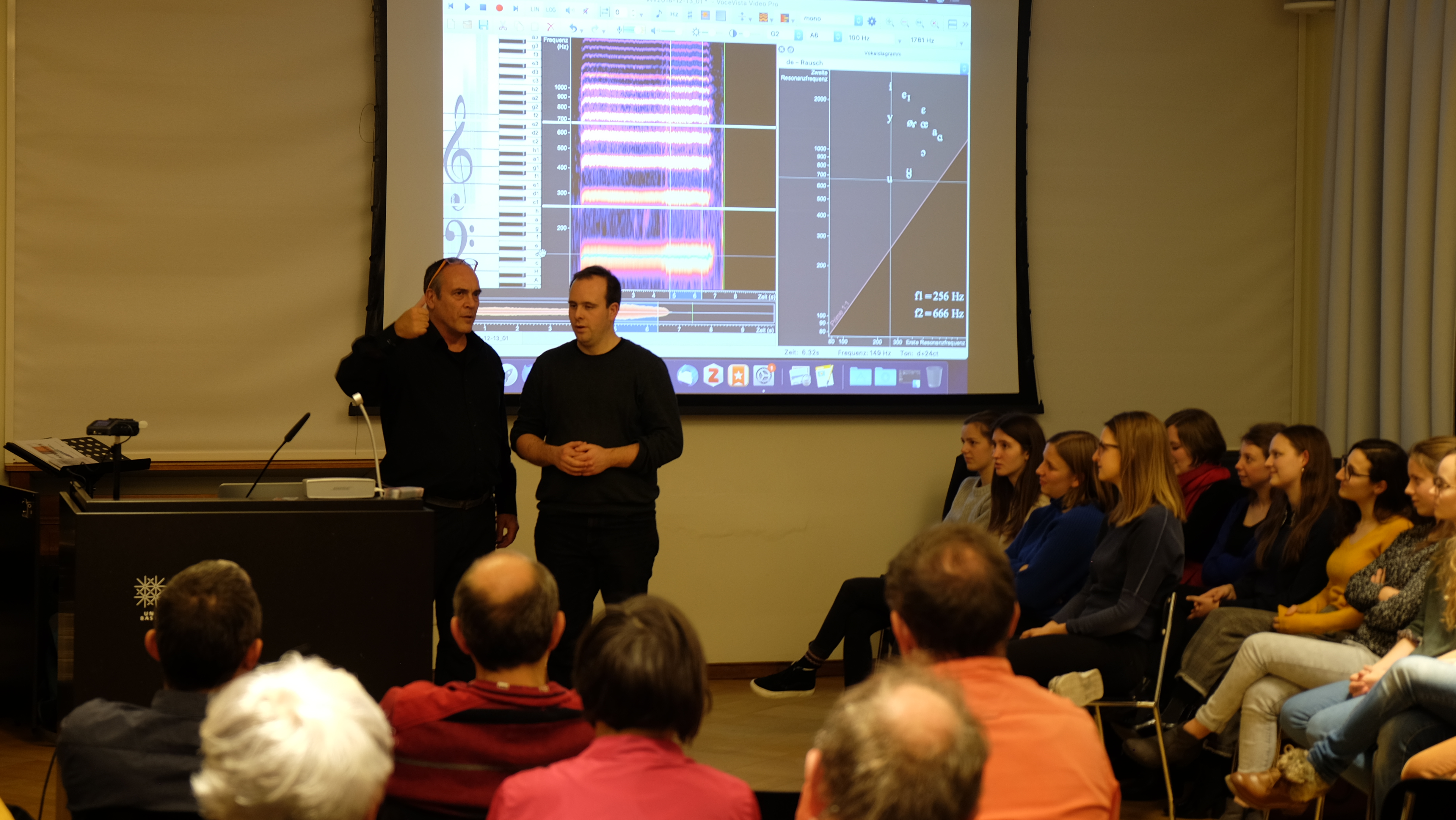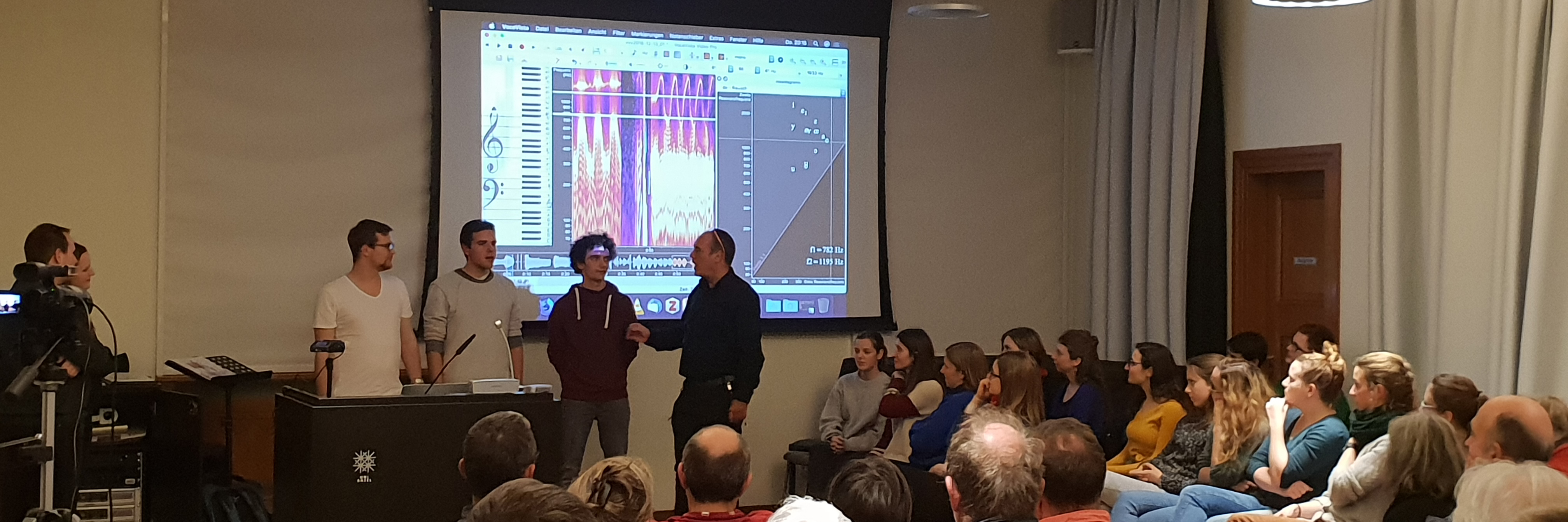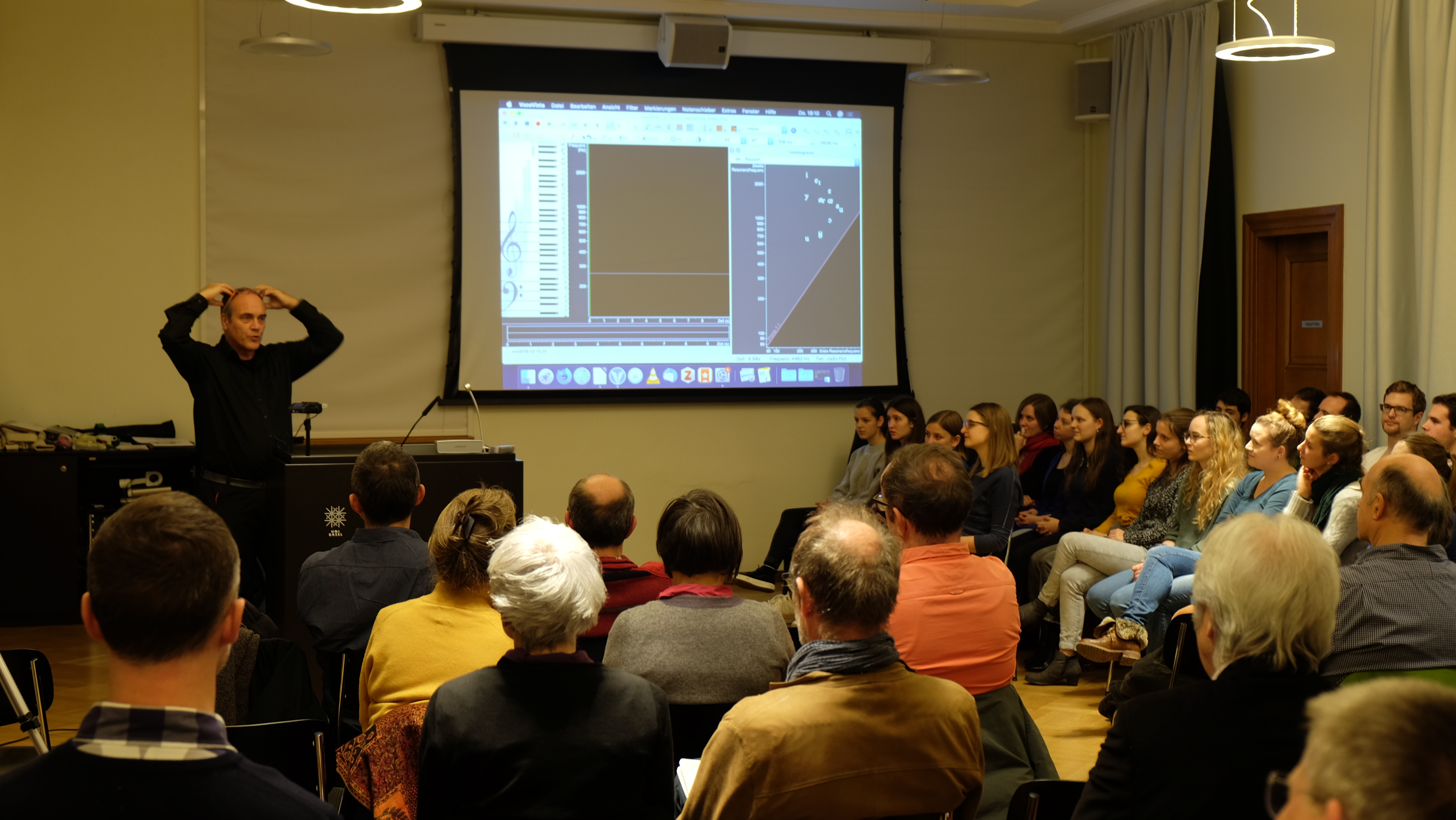 Im ersten Teil des interaktiven Kolloquiums wurden die Teilnehmenden auf eine Bildungsreise mitgenommen, nicht wie vielleicht erwartet zu stimmbildnerischen Pirouetten, um Obertongesang zu trainieren, sondern zu intensiver Gehörbildung. Die Besucher wurden eingeladen, eine Obertonmelodie zu erkennen, was zu Beginn fast gänzlich unmöglich war und mit der Zeit immer einfacher wurde. Wolfgang Saus zeigte auf eindrückliche Weise, wie mit entsprechendem Training die Dominanz der Sprachverarbeitung in unserem Hirn zu Gunsten einer reichhaltigeren Klangerfahrung gedrosselt werden kann. Die Dekonstruktion des Stimmklangs wurde im Verlauf des Vortrags mit Hilfe einer vom Redner mitentwickelten Software immer wieder visualisiert und das Klangerleben damit erstaunlicherweise auch einfacher hörbar. Die stimmliche Virtuosität, mit welcher Wolfgang Saus seine Erläuterungen zum Klingen gebracht hat, hatte durchaus eine magische Komponente.