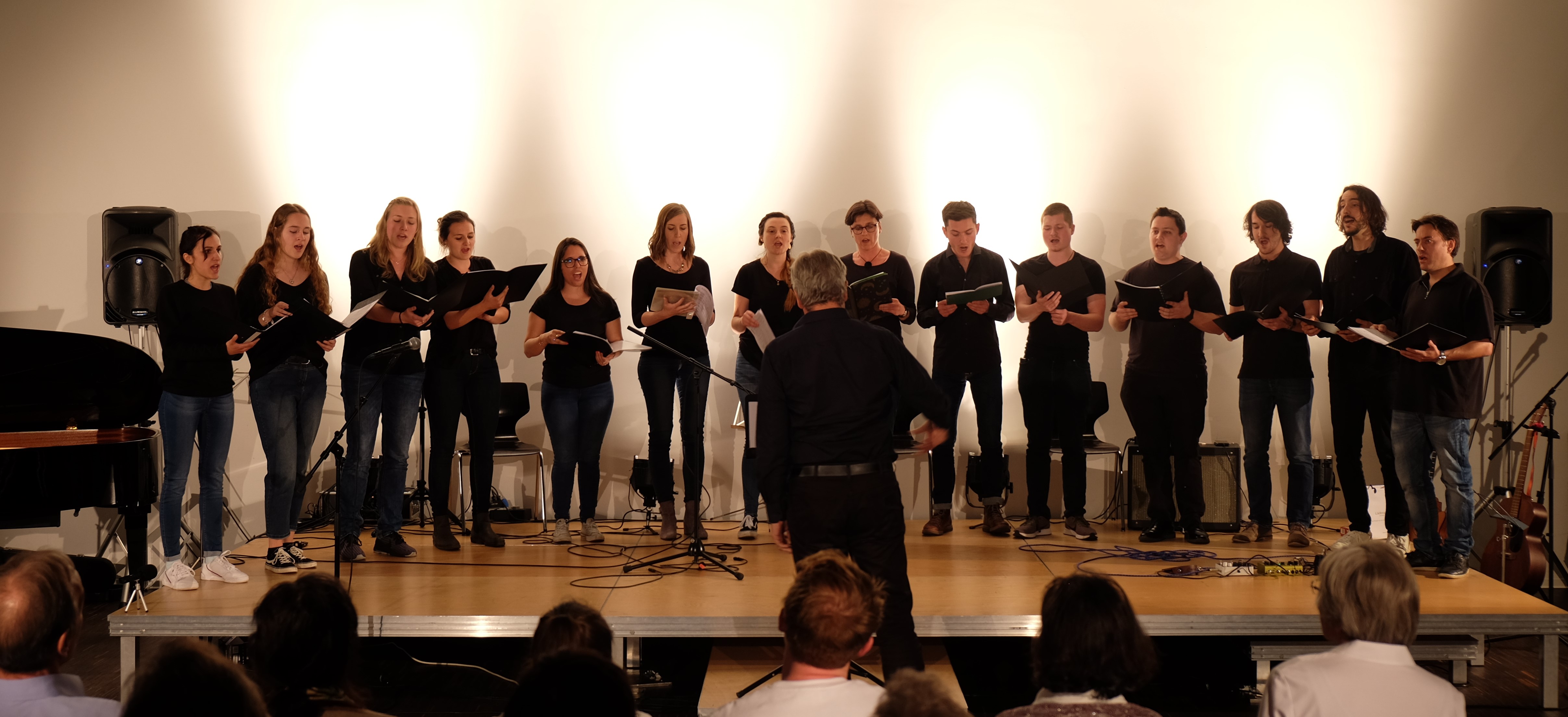 Die Duette der Sängerinnen Corinne Geissmann und Jeannine Abt waren von unterschiedlichen Stimmungen geprägt und begeisterten einerseits durch ausgeklügelten Spieltechniken auf der Gitarre und einen sehr harmonischen zweistimmigen Gesang. Jan Kryl schliesslich wagte sich in die Gefilde fremdsprachiger Kulturen und traute sich auf Katalan und auf Romanes authentisch und mit interessanten Spieltechniken zwei Lieder zum Besten zu geben; seine angedeutete Erkältung war aus dem Publikum nicht wahrzunehmen, eher stach seine tiefe, sonore Stimme hervor. Ursina Bill sang den emotionalen Titelsong "Gabriellas Song" aus dem Film "As it is in heaven" und zeigte an diesem Stück mit grossem Stimmumfang, was sie im Gesangsunterricht erreicht hat. Und wieder überraschte ein junger Herr mit einem selbstgeschriebenen Lied: Patrick Diethelm zeigte sich als geübter Singer-Songwriter, der seine Welt in Musik erklärt. Mit einem uns wohlbekannten Hit aus dem Radio: "Run" von Leona Lewis rundete Katharina Stathis das Programm der Einzelbeiträge ab. Sie wagte eine gefühlvolle und intimere Version als es das Original vermittelt.