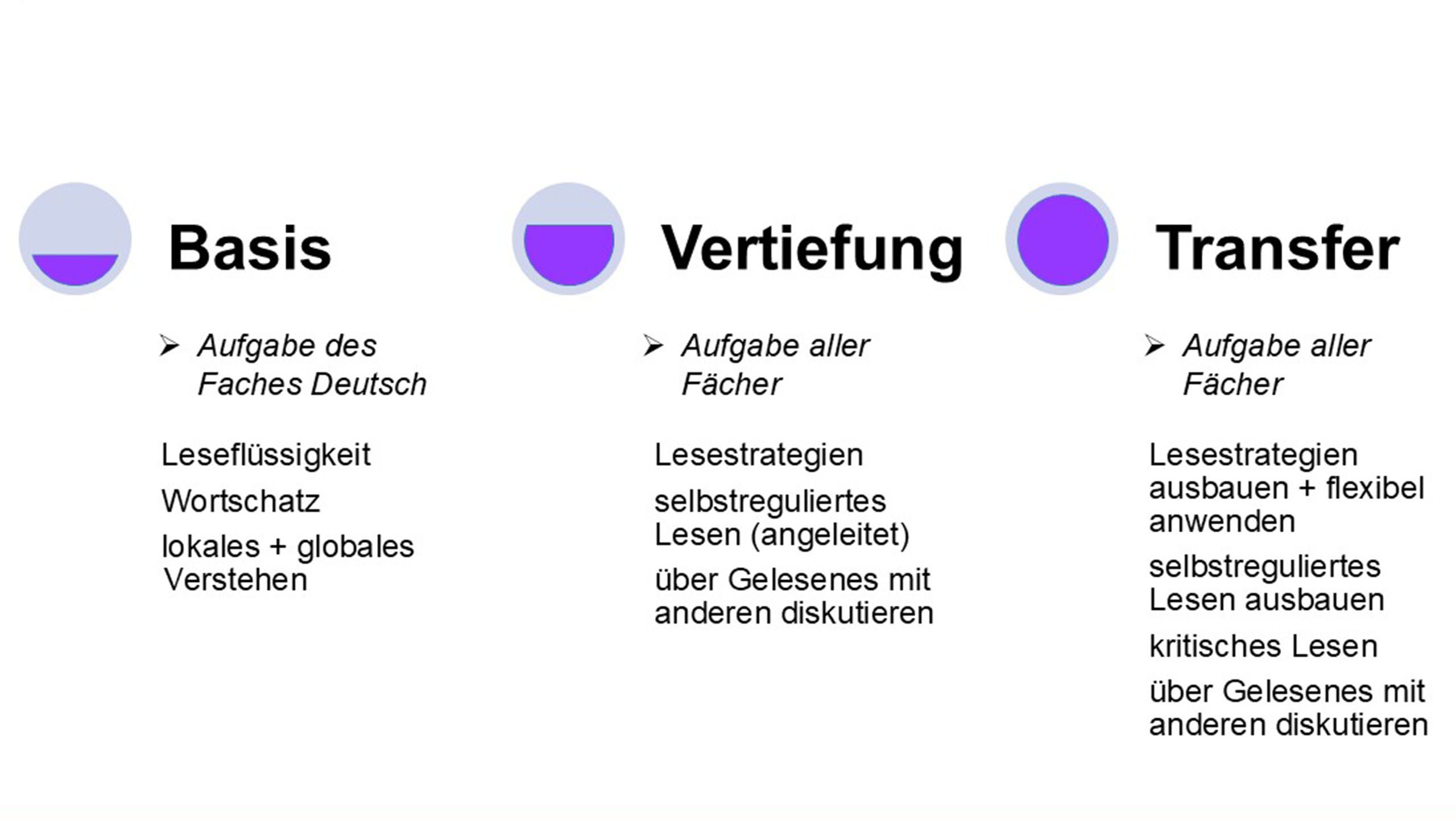 Letzteres macht Absprachen zwischen Bildungsetappen, Stufen und Fächern notwendig. Ziel ist es, Leistungserwartungen zu klären, ein gemeinsames Verständnis für eine wirksame Förderung zu entwickeln und auch Gefässe für die Förderung von Leseschwachen zu schaffen, vor allem auf der Sekundarstufe I und II. Hier ist die Förderung der basalen Lesefertigkeiten häufig abgeschlossen.