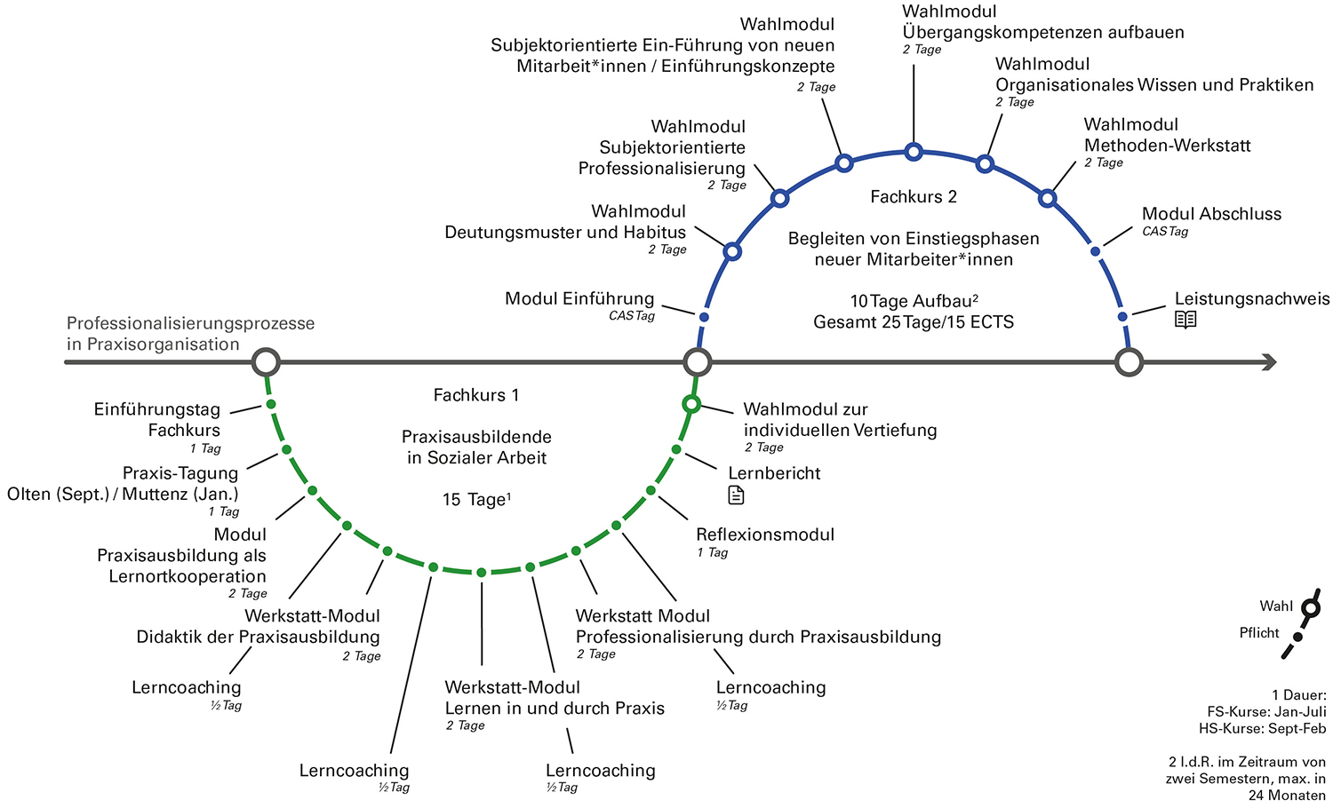 Praxisorganisationen bieten wir unverändert mit über 120 Kursplätzen pro Jahr und der nun Fachkurs 1 Praxisausbildende in der Sozialen Arbeit genannten 15-tägigen Weiterbildung die Doppelqualifizierung für ihre Praxisausbildenden an, mit der sie schweizweit sowohl FH- wie HF-Studierende begleiten können.