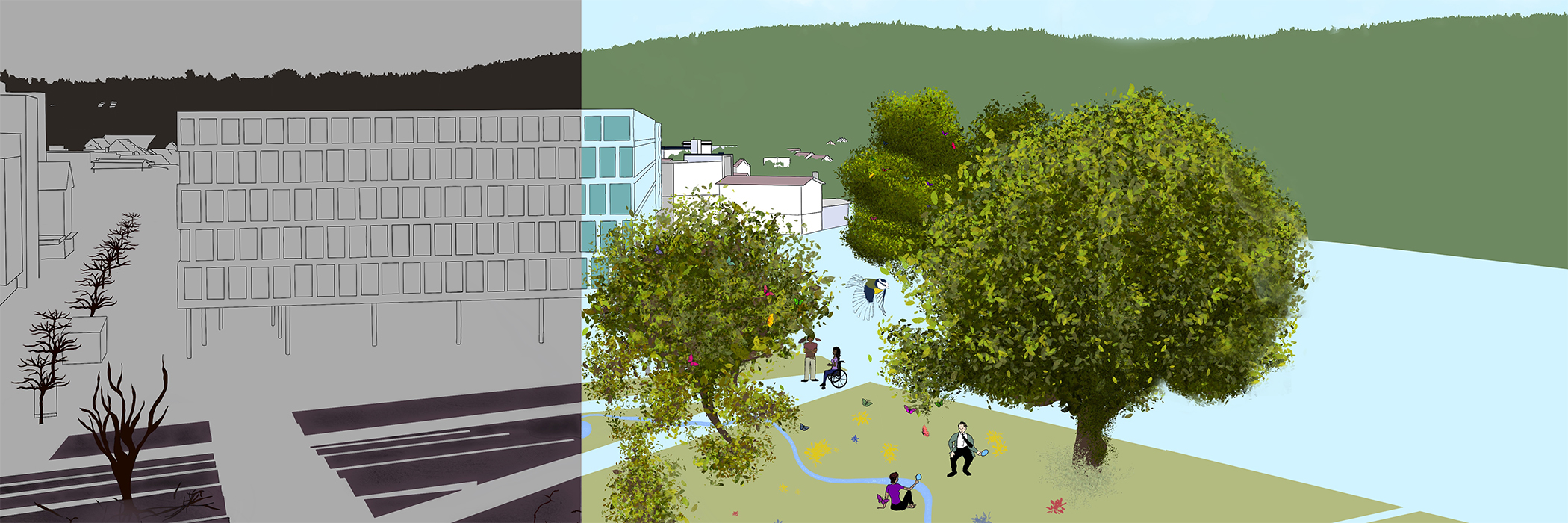Unser Fokus liegt auf Zusammenarbeit: Wir wollen die Aussenräume der Campusse zu Lebensräumen machen – für Menschen und nicht-menschliche Wesen. Orte, an denen alle gedeihen können: