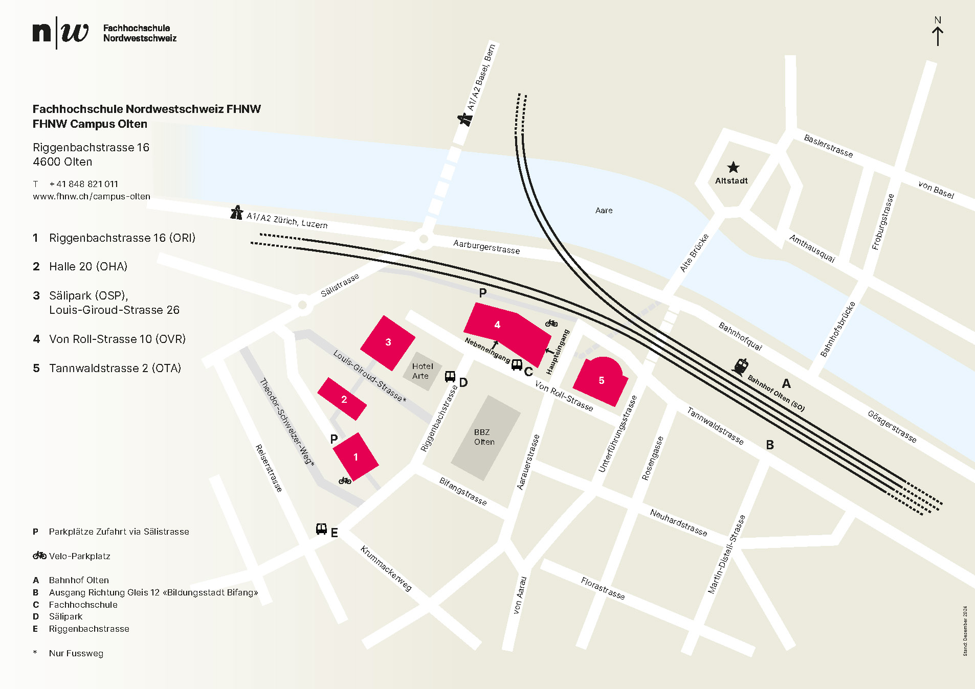 Mit öffentlichen Verkehrsmittel erreichen Sie den Campus ab Basel, Bern, Luzern und Zürich in rund 30 Minuten. Zu Fuss ist der Campus Olten in wenigen Minuten vom Bahnhof SBB aus erreichbar. Sie müssen nicht zusätzlich einen Bus nehmen. Verlassen Sie den Bahnhof Olten auf der Südseite beim Gleis 12. Folgen Sie den Beschriftungen.