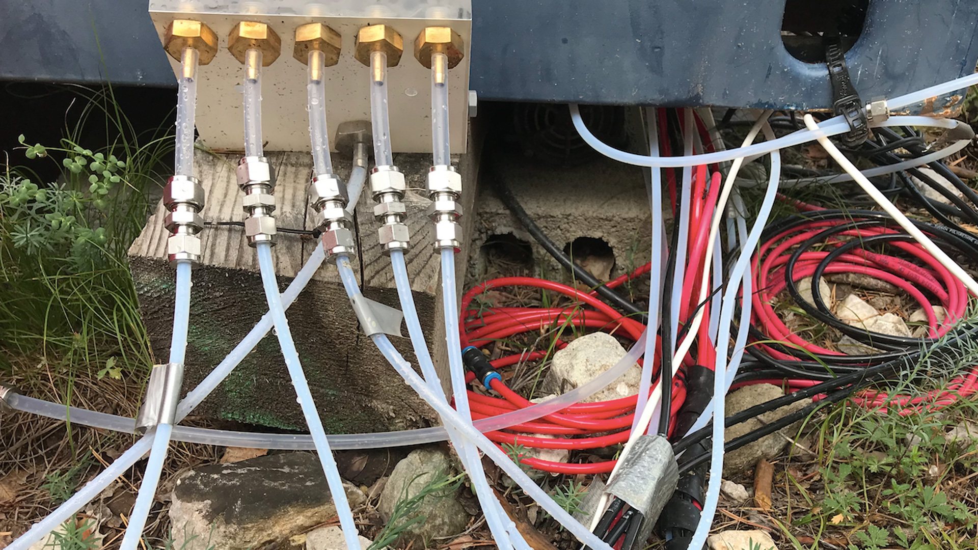 Expanding the artistic research on volatile emissions, the resin, responsible for the pine scent, was harvested during the various field trips to Pfynwald and transformed into the volatile liquid of turpentine and colophon sculpture, accompanying VR installation.
