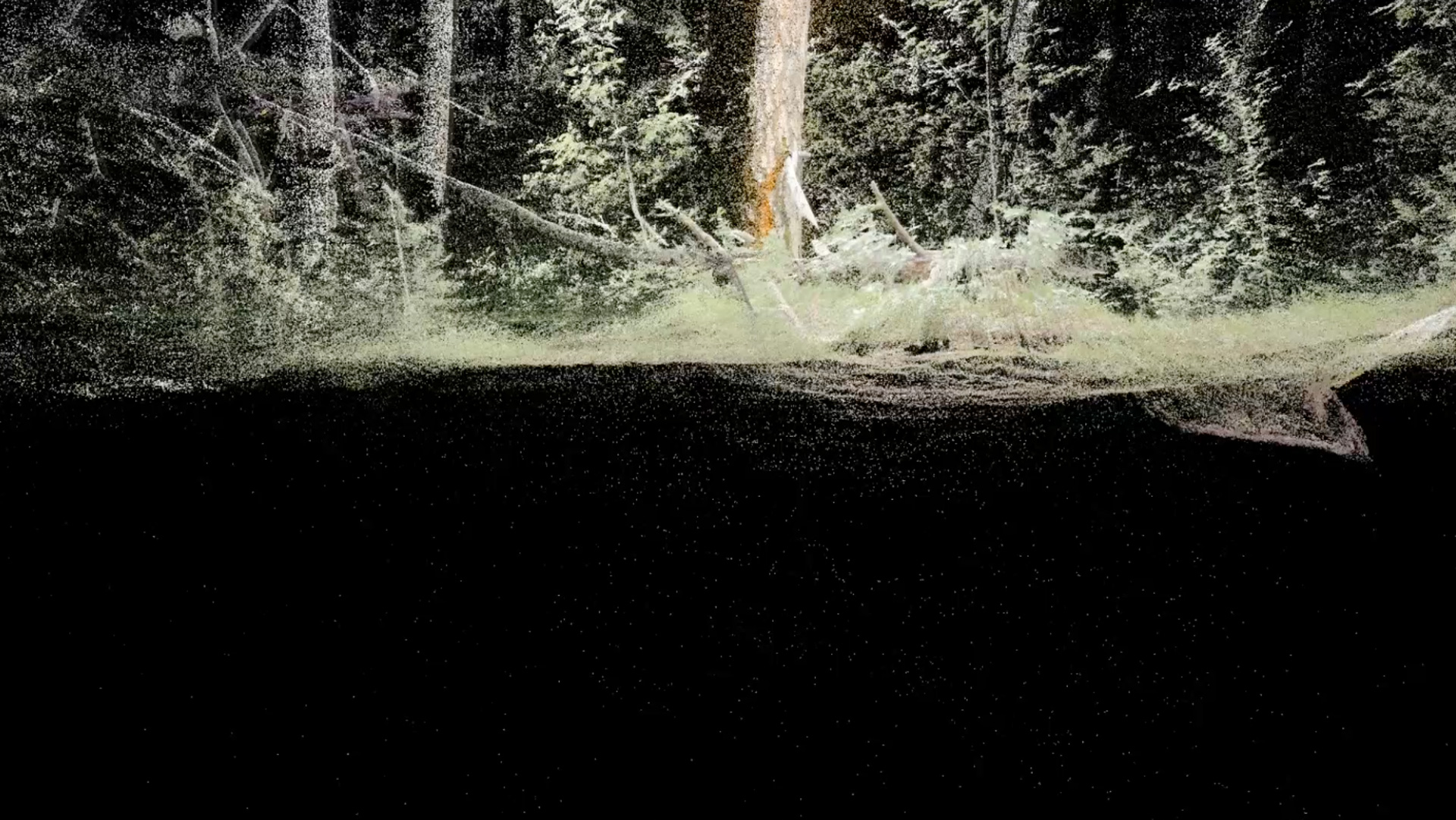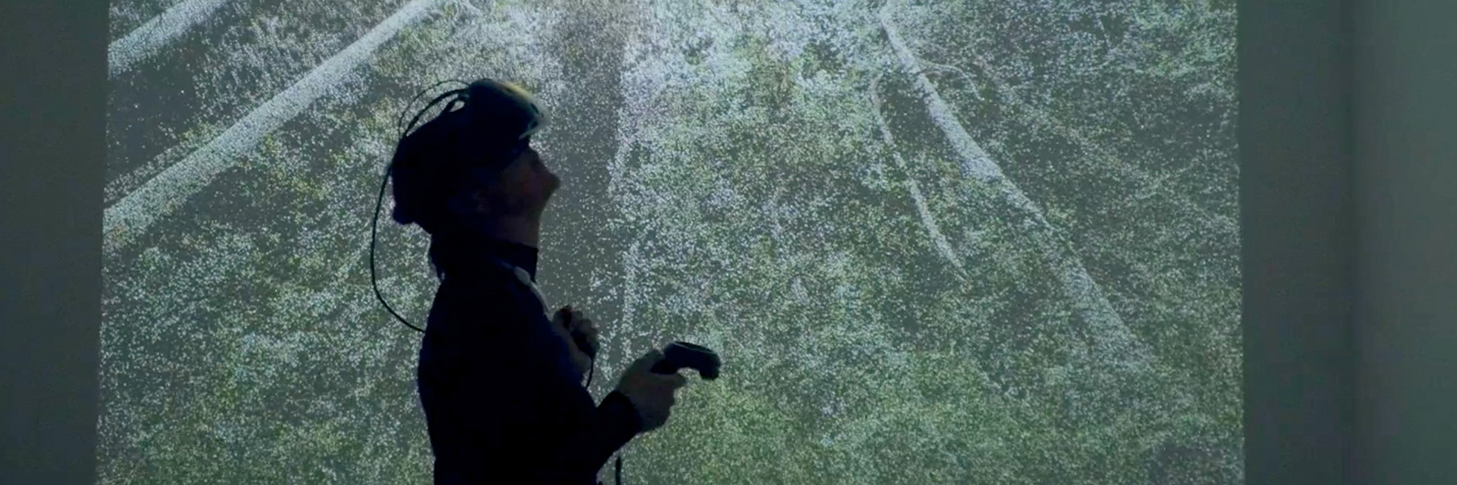 To create the Atmospheric Forest in VR, the scientific laser scanner was used to scan the Pfynwald in point cloud. The viewer can navigate through the emitting trees of virtual forest, and notice the watchtower, pink labels attached to the plants, measuring belts around the barks, and other scientific artefacts. The viewer also can observe the forest ecosystem from the bottom up, and follow the path through the tree trunk to get far up above the forest, becoming a part of the emitting forest ecosystem that connects 'terrestrial' and 'atmospheric'.