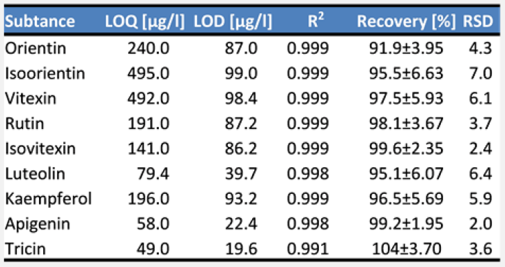 The LC-MS/MS method for quantification of the major bamboo flavonoids was robust and valid: