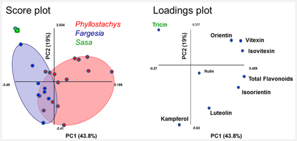 Different bamboo species can be clearly distinguished by an altered flavonoid profile. In addition different bamboo genera show characteristic patterns of individual flavonoids. Phyllostachys bamboo generally exhibits both higher total and higher individual flavonoid levels compared to Fargesia murielae and Sasa. Tricin is most prominently found in Sasa bamboo. Anti-oxidative capacity was found to be similar for all bamboo genera. Principal component analysis, based on flavonoid levels for the 24 different bamboo species, clearly reveals similarities within a genus and differences in between the genera.