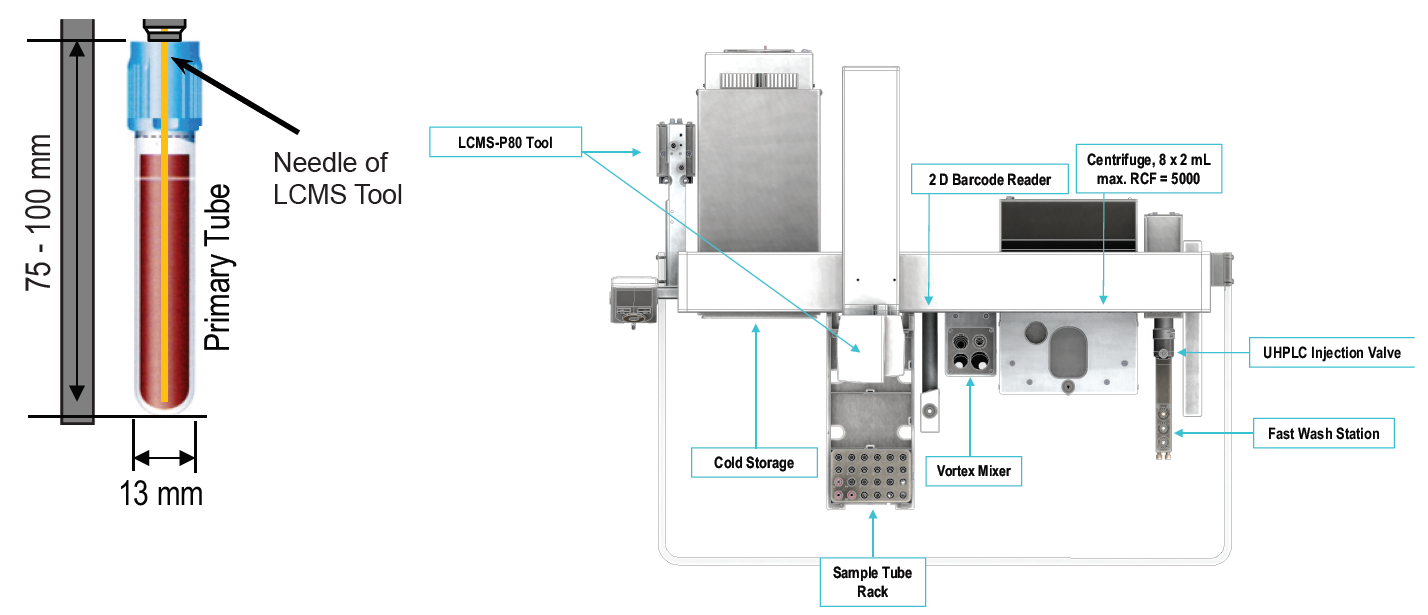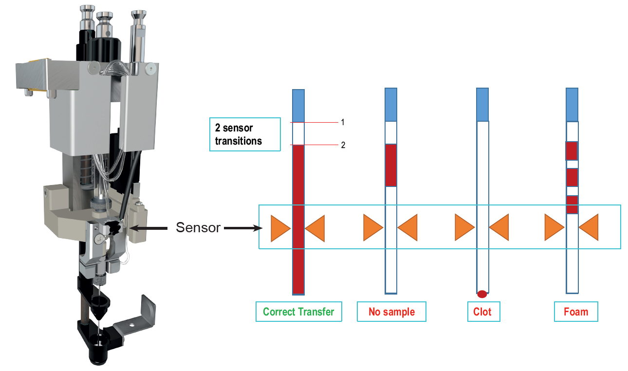 Automated sample preparation reduces cost per sample and minimizes sample handling errors. The use of robots is well established for therapeutic drug monitoring or diagnostics based on blood samples. Usually expensive and highly specialized pipetting robots are used. However, most of these systems are not designed with a direct interface for LC-MS applications and common pipetting systems are not optimized for smaller scale sample series. Here we present a new tool for liquid handling of whole blood samples and direct sample injection. The tool features an optical sensor that monitors all liquid handling steps. It detects presence or absence of sample, standards and reagents. The sensor is essential to ensure process safety for automated liquid handling steps.