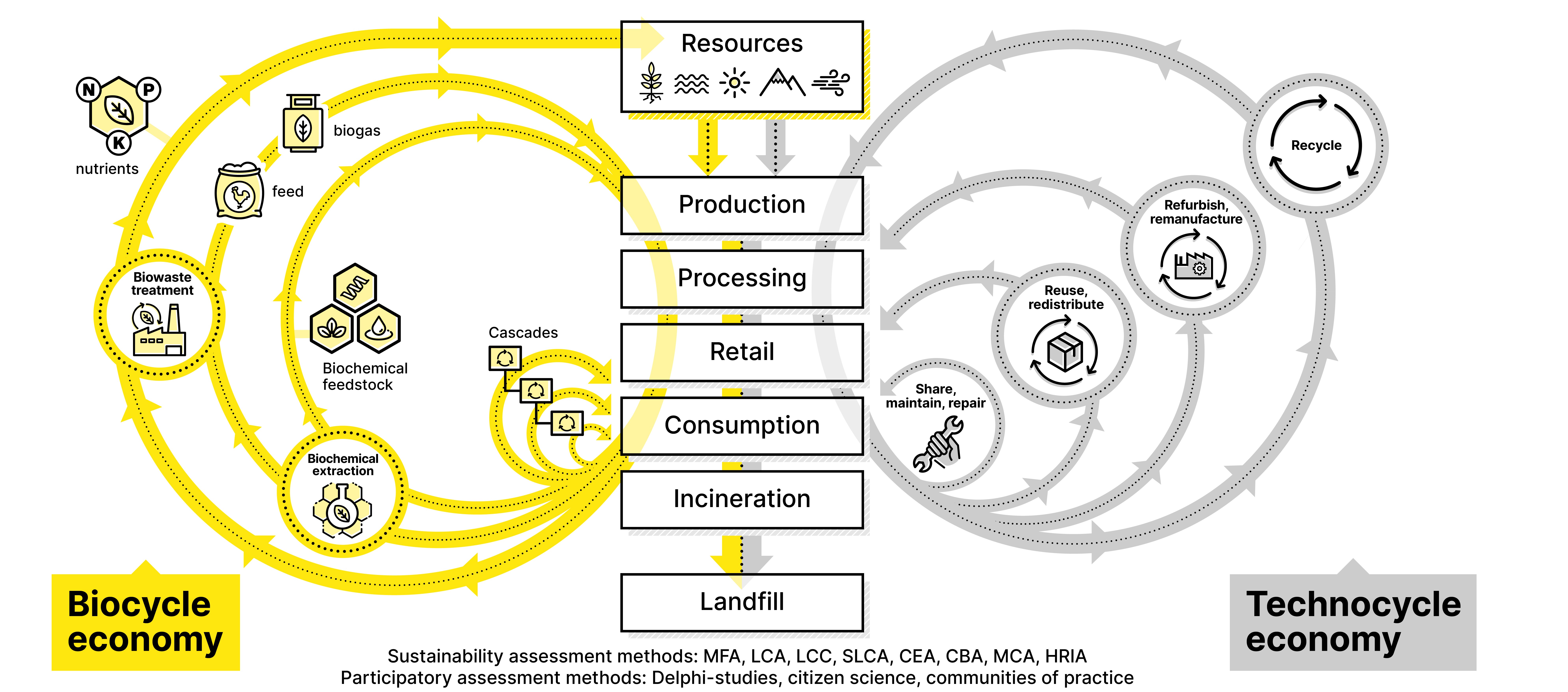 Die NRM-Gruppe untersucht die Auswirkungen von Konsum- und Produktionssystemen (SDG 12) auf die planetare Gesundheit, d.h. die menschliche Gesundheit (SDG 3) sowie die Gesundheit von Ökosystemen und Ressourcen (SDG 6, 13, 14, 15). Zusammen mit der Praxis entwickeln wir Konzepte und bewerten Projekte zu nachhaltigem Konsum und Produktion in biologischen und technischen Kreislaufsystemen, wie in der Abbildung dargestellt (‘Biocycle and Technocycle Economy’). Unser Forschungsteam greift dabei auf eine breite Palette von Nachhaltigkeits- und Bewertungsmethoden sowie auf starke Kooperationen innerhalb nationaler und internationaler Forschungsnetzwerke zurück.