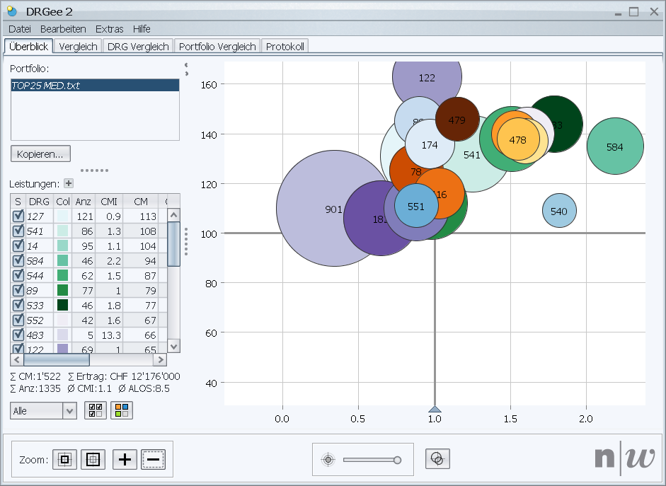 The switch to a DRG-based health care payment system in Switzerland causes a big need for hospitals to reevaluate the profitability of their service portfolio under this new system. Consultants have developed a model to analyze portfolios and create future scenarios. In order to steer the strategy finding and communicate the results of this modeling, we developed an interactive visualization tool that allows dynamic interactions with this complex information in live strategy meetings.