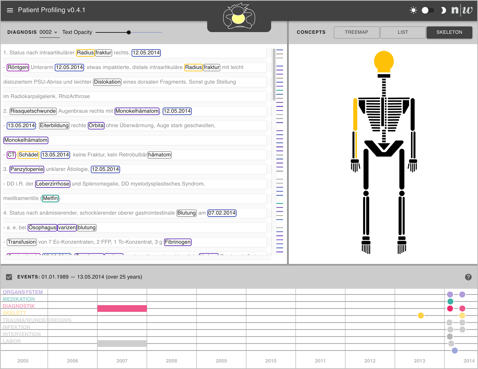 Wir haben einen Prototypen entwickelt, der in mehreren verknüpften Visualisierungen die verschiedenen Aspekte einer Diagnoseliste sichtbar macht (betroffene Organsysteme oder Knochen, Medikation, Behandlungen, Untersuchungen, etc.) und sie mit den relevanten Stellen im Text verlinkt. Diese interaktive Applikation ermöglicht es, schnell und effektiv einen Überblick über umfangreiche und komplexe Krankheitsgeschichten zu erhalten.