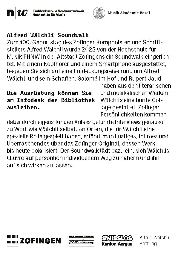 2022 jährt sich der Geburtstag des Komponisten und Schriftstellers Alfred Wälchli zum 100. Mal. Diesen Umstand nimmt das Forschungsteam in Zusammenarbeit mit der Alfred Wälchli-Stiftung und der Stadt Zofingen zum Anlass, um ein divers angelegtes Forschungs- und Vermittlungsprojekt zu initiieren. Eine Noten-Edition, die Generierung und Sicherung von Forschungsdaten sowie die Weiterentwicklung der H.E.I.-Technologie, die in ein Vermittlungsprojekt in Form eines Sound- Walks münden, speisen sich gegenseitig.