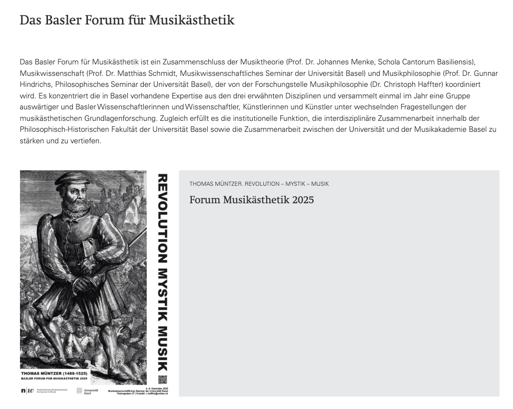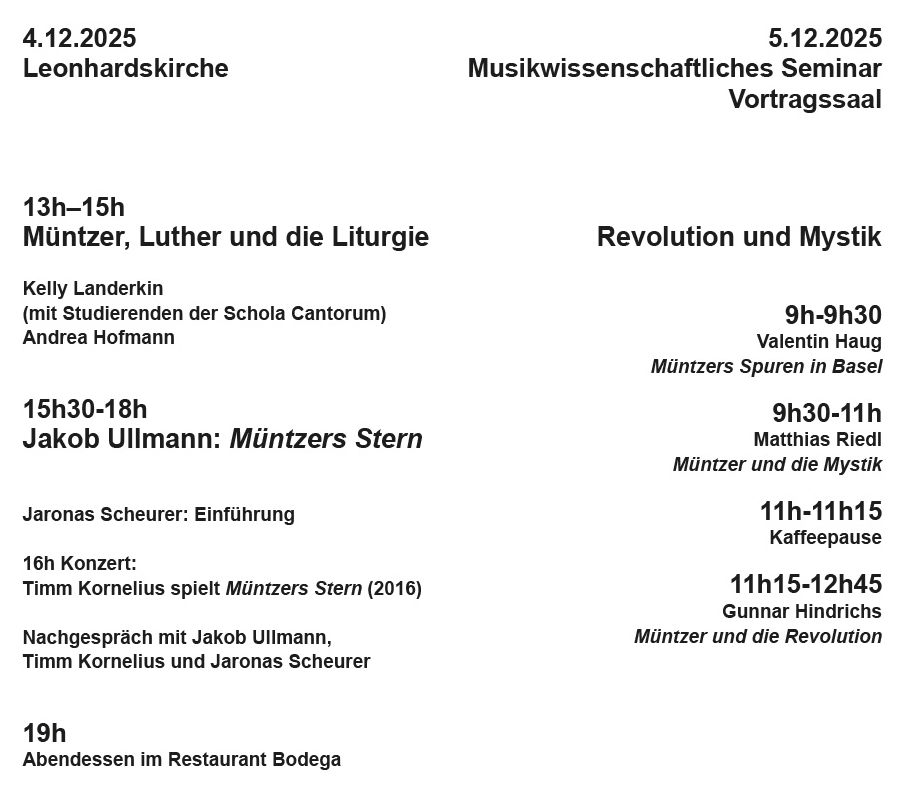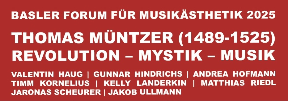 Das Forum Musikästhetik lädt jährlich Personen aus Wissenschaft und Kunst ein, um ein musikästhetisches Problem zu diskutieren. Ausgangspunkt dieser Diskussionen sind kurze Vorträge von Gästen: Für diese Ausgabe werden unter anderem Kelly Landerkin von der Schola Cantorum Basiliensis und Andrea Hofmann aus der Theologischen Fakultät der Uni Basel die musikalische und liturgische Besonderheit von Müntzers Reformprogramm in Abgrenzung zu seinem Kontrahenten Martin Luther erörtern, Gunnar Hindrichs vom Philosophischen Seminar der Uni Basel wird zur Wirkungsgeschichte von Müntzers politischer Theologie im 20. Jahrhundert besonders bei Ernst Bloch sprechen und der Historiker Matthias Riedl wird Müntzers Mystikkonzeption präsentieren.