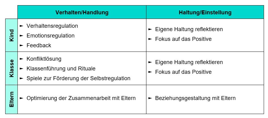 Die FOSSA-Weiterbildung umfasst die drei Grundpfeiler «Unterstützung von Kindern mit Verhaltensauffälligkeiten», «Klassenführung» sowie «Zusammenarbeit mit den Eltern». In der Tabelle sind die Ebenen «Kind», «Klasse» und «Eltern» dargestellt sowie die Dimensionen «Verhalten/Handlung» und «Haltung/Einstellung». Zu allen sechs Bereichen wird thematisiert, wie die Lehrperson sich verhalten oder handeln kann und wie sie ihre Haltung/Einstellung reflektieren bzw. in eine positive Richtung verändern kann.