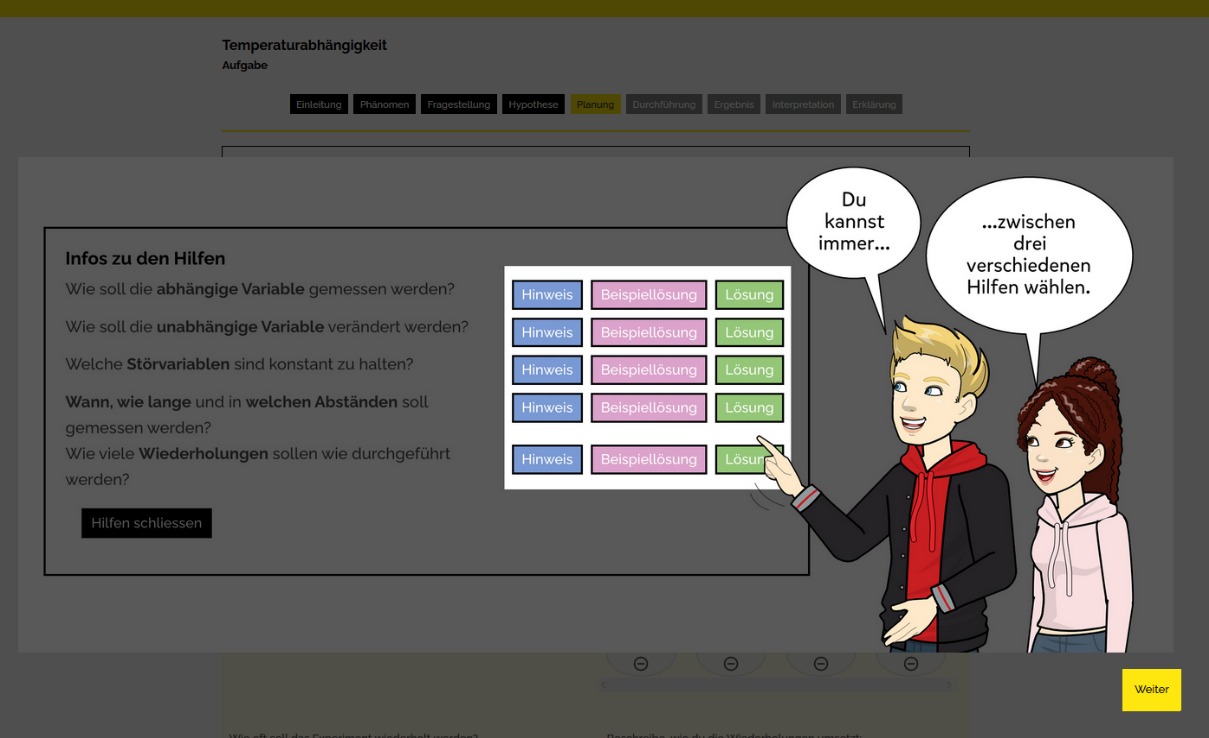 Daraus ergibt sie die Frage: Wie können Lernende kognitiv und motivational angeleitet werden, für sich die Hilfe zu finden, die ihr Lernen beim Planen von Experimenten ideal unterstützt? Diese und weitere Fragen werden in der Studie zur Wahl und Nutzung von gestuften Lernhilfen nachgegangen und geklärt.