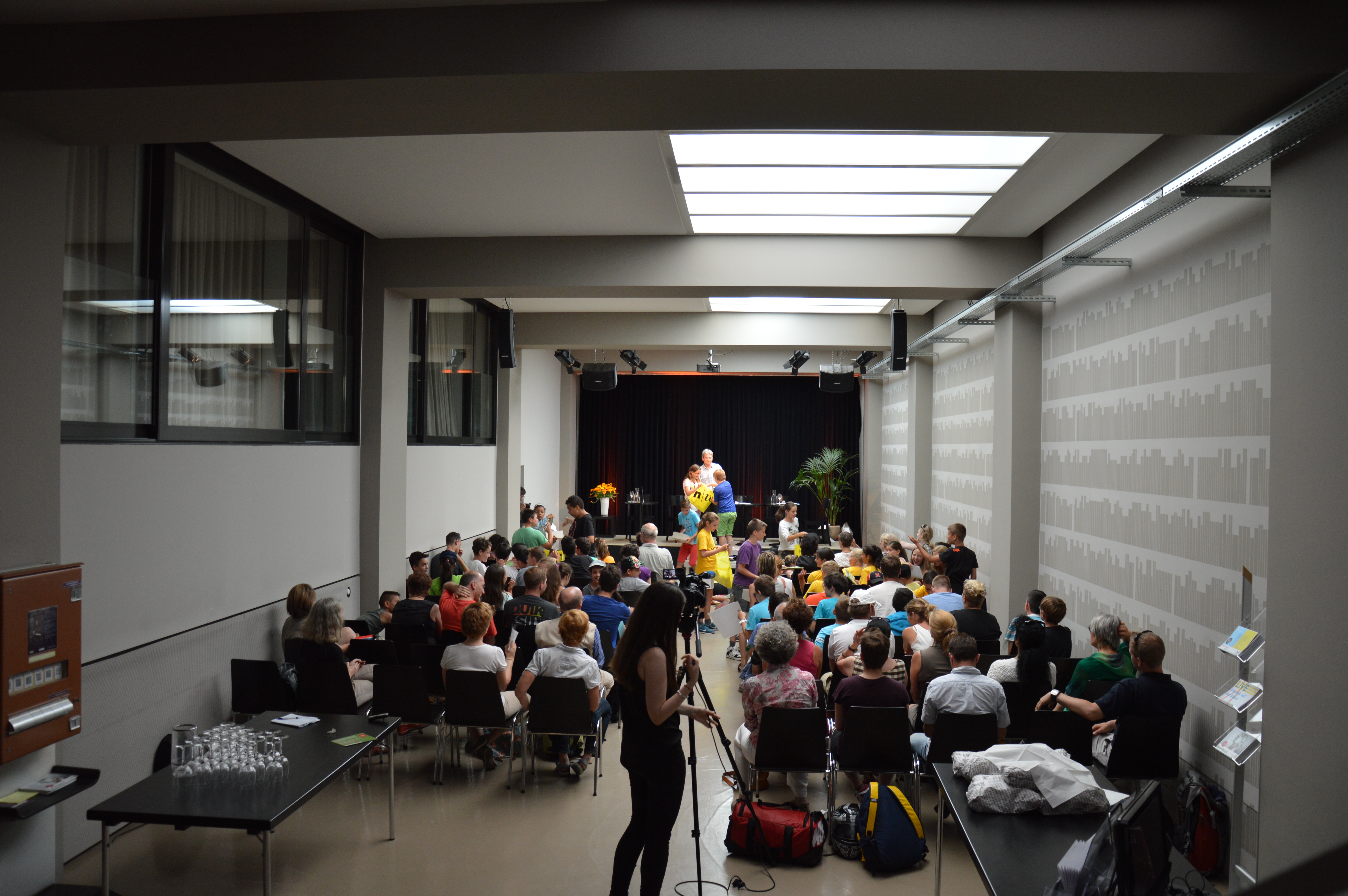 Am Nachmittag wurde das Kinder- und Jugendbuch «Vier verrückte Fussballgeschichten» (erschienen im kwasi Verlag) im Literaturhaus Basel präsentiert. Die Klassen hatten im Vorfeld gemeinsam mit den Autor/-innen die spannendsten Stellen ihrer eigenen Texte herausgesucht. Die Schauspielerin Ute Sengebusch las diese Textstellen vor und jede Klasse berichtete gemeinsam mit ihrem Schreibcoach anschliessend von einigen interessanten Begebenheiten aus dem Entstehungsprozess ihrer Fussballgeschichte.