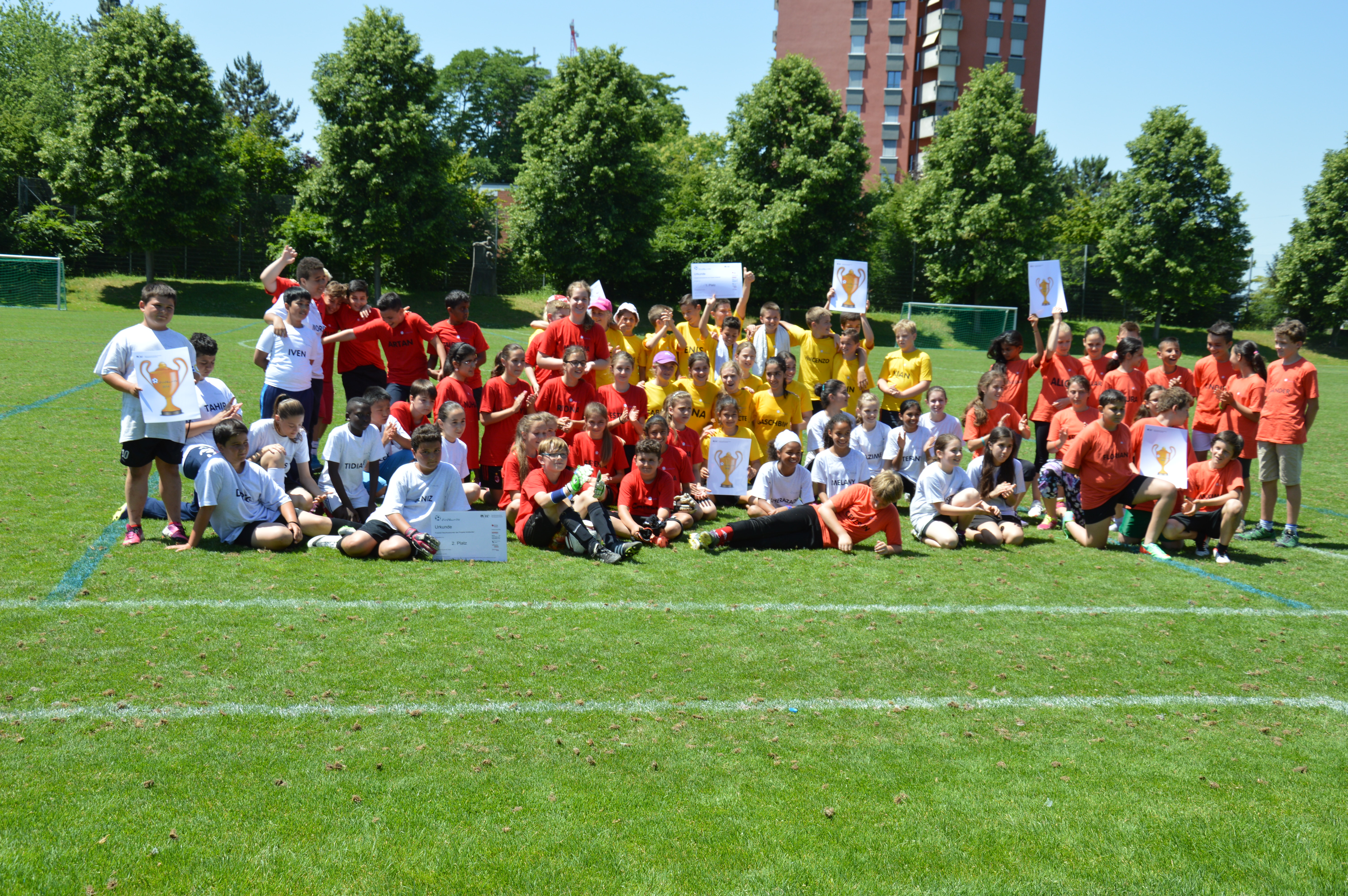 Alle Klassen haben am Ende des Fussballturniers gemeinsam ihre Pokale und Urkunden feiern können.