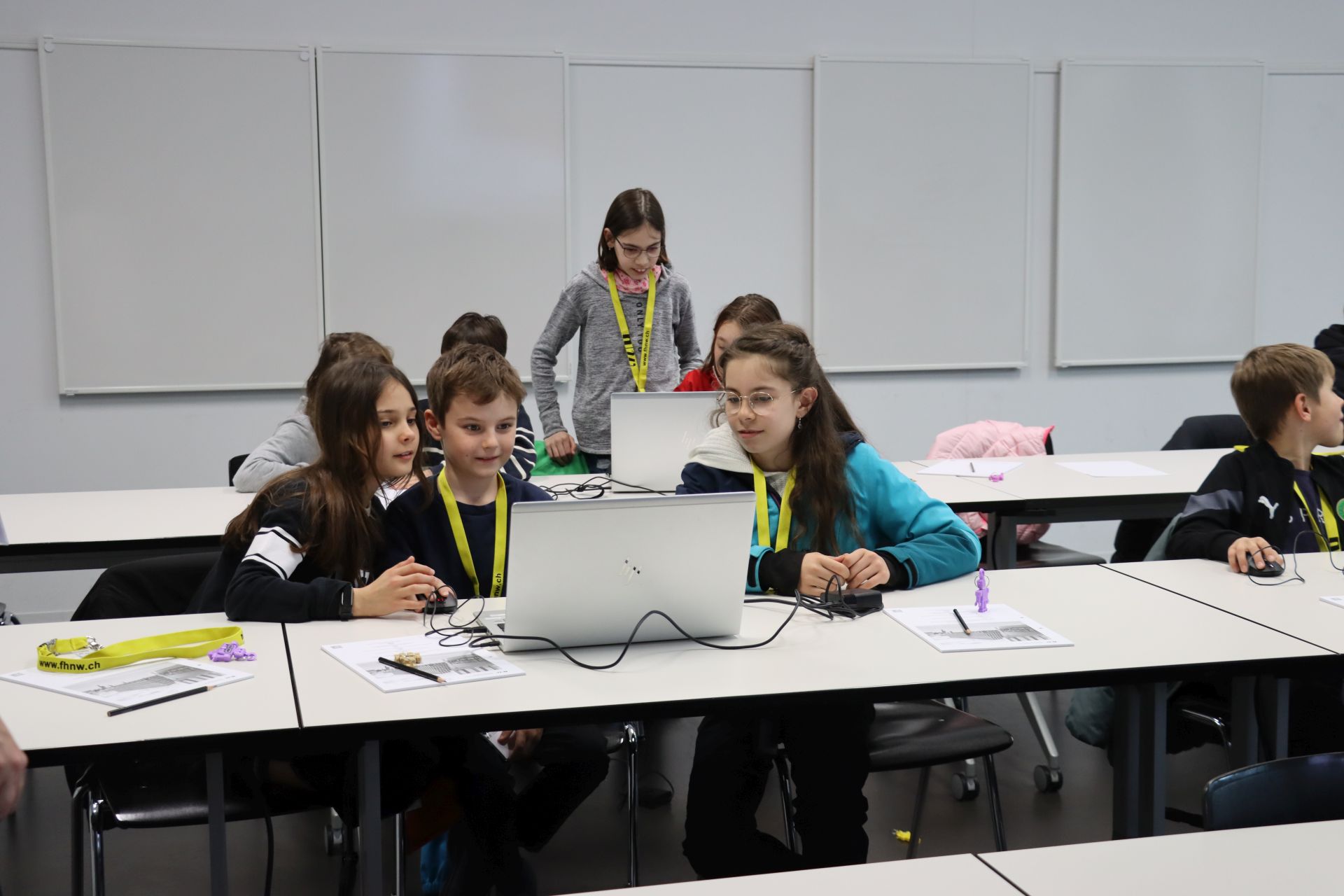 Etwa 20 Mädchen und Jungen von der 4. bis 6. Klasse sind im Unterrichtsraum auf dem FHNW Campus Brugg-Windisch. Die Veranstaltung «Bilder generieren mit Künstlicher Intelligenz» ist eine von insgesamt 14 Veranstaltungen der FHNW Kinderhochschule.
