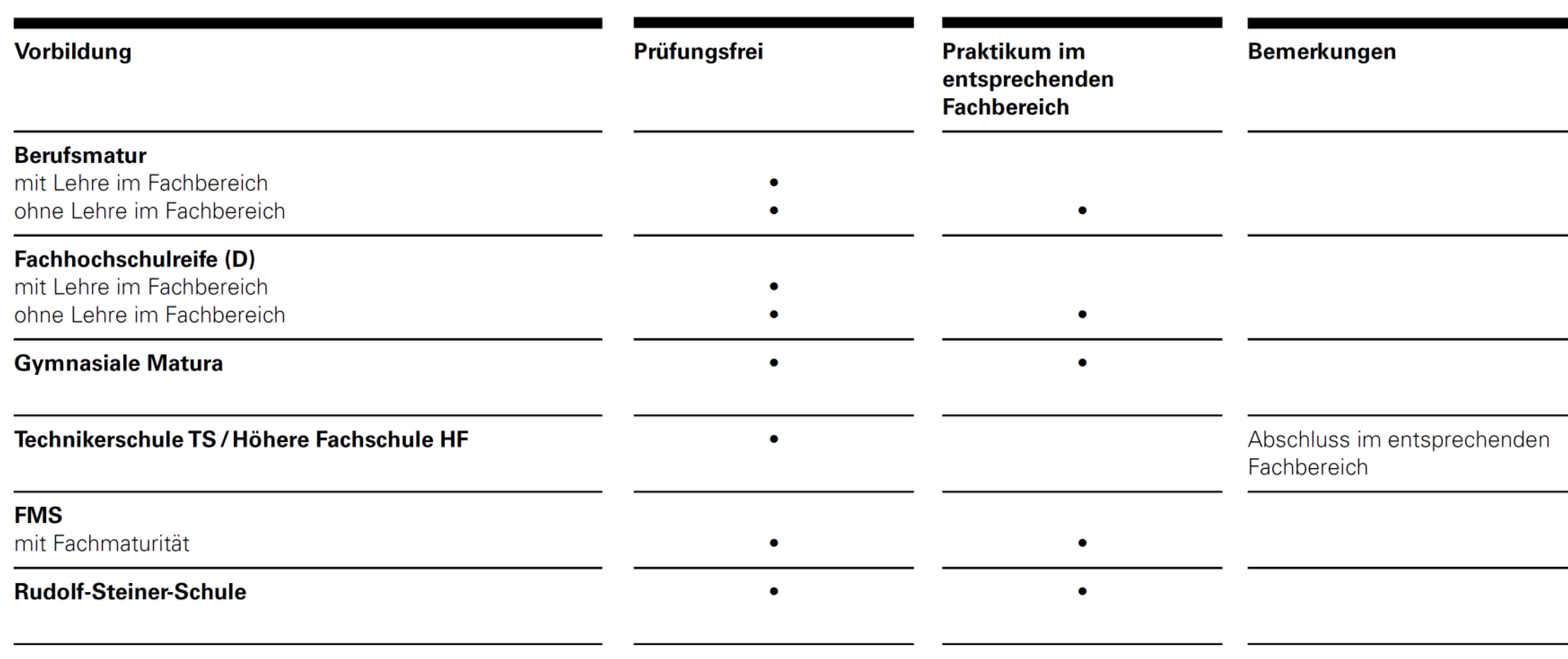 Bedingung für den prüfungsfreien Eintritt zum Bachelorstudium Bauingenieurwesen sind eine Berufslehre mit Berufsmaturität oder eine gymnasiale Maturität mit einer einjährigen Arbeitswelterfahrung im Fachgebiet des Bauwesens. Folgende berufliche Grundlagen (Berufslehren) werden für die Zulassung zum Bachelorstudiengang Bauingenieurwesen anerkannt: