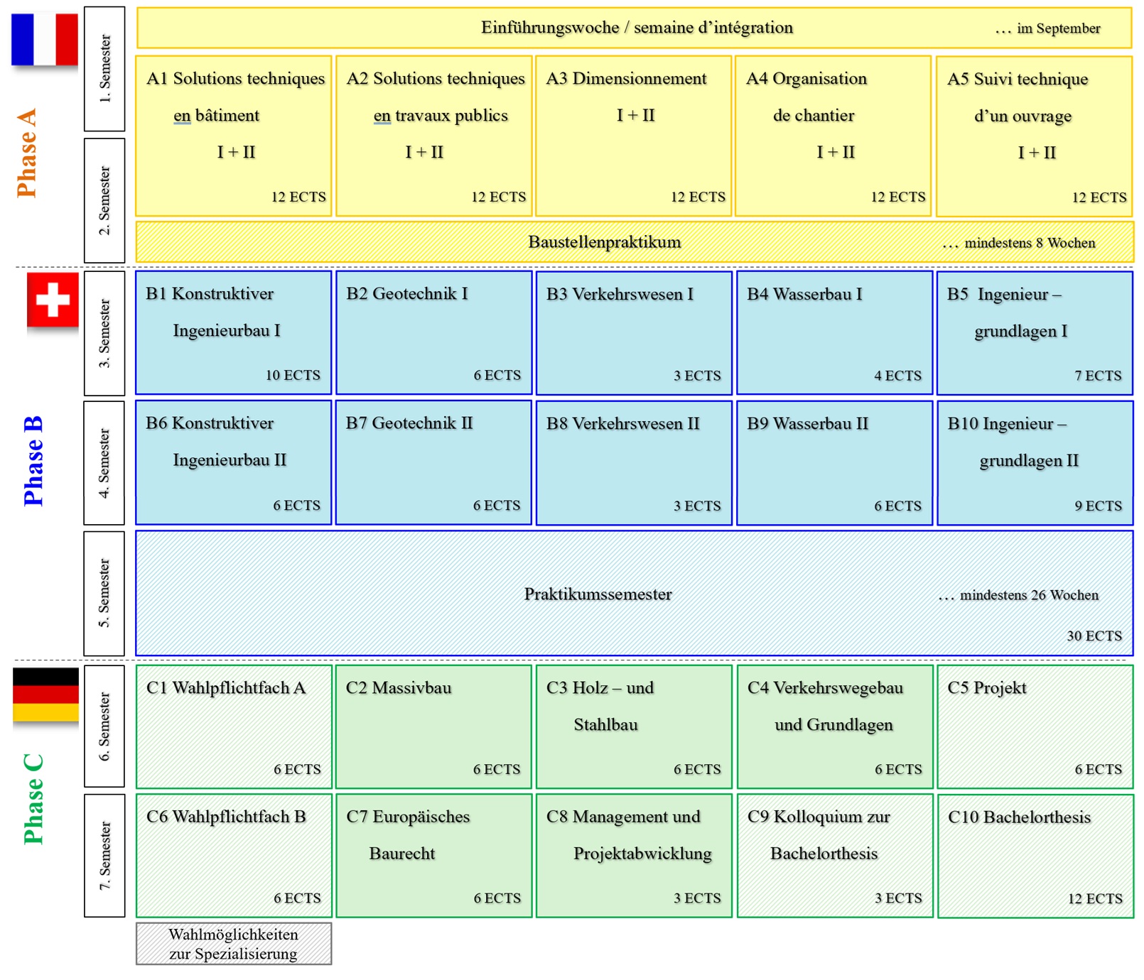 - Phase A in Frankreich (IUT, Campus Illkirch): 10 Module in den ersten zwei Semestern (60 ECTS), dazu die obligatorische Einführungswoche und ein Baustellenpraktikum von mindestens 8 Wochen.