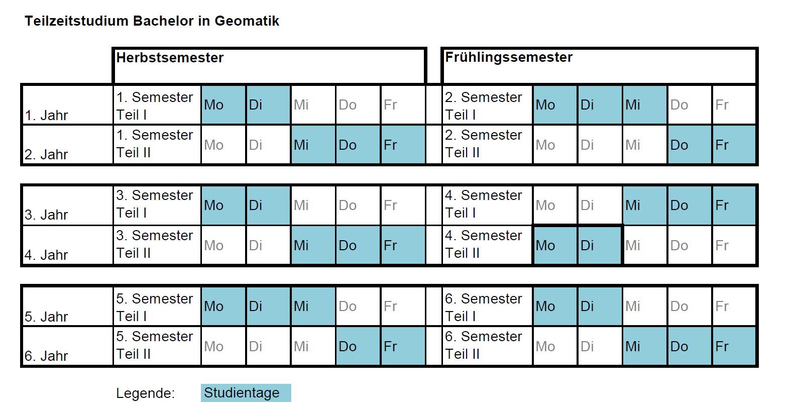Der Bachelorstudiengang in Geomatik kann entweder als Vollzeit- oder als Teilzeitstudium oder in einer Mischform absolviert werden.