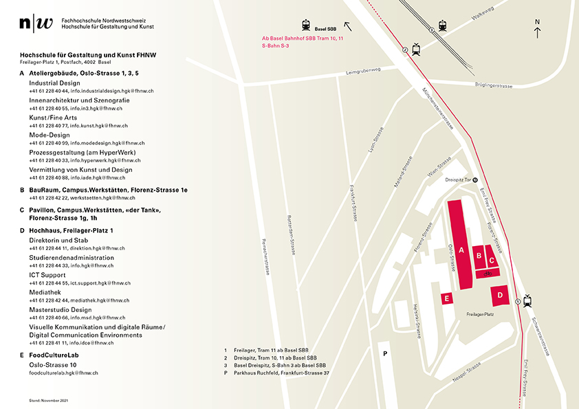 Der Campus ist mit öffentlichen Verkehrsmitteln optimal erreichbar. Die Haltestelle Freilager der BLT-Tramlinie 11 befindet sich unmittelbar vor dem Campus (ab Bahnhof Basel SBB Richtung Aesch).