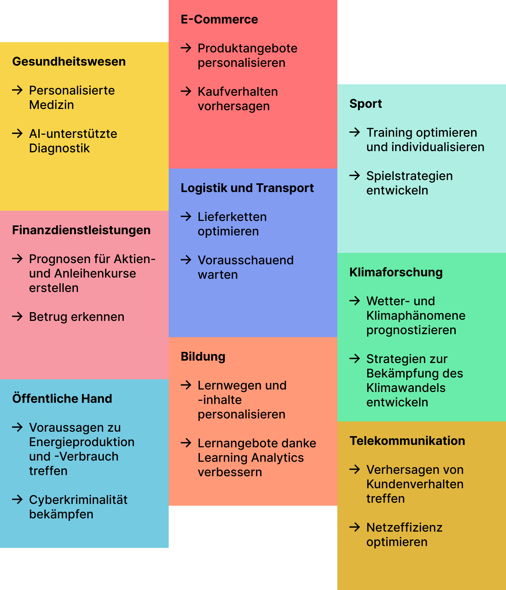 Data Science findet Anwendung in einer Vielzahl von Bereichen, darunter Forschung, Logistik, Nachhaltigkeit, Automation, Energie, Robotik, Einzelhandel, Sport und vieles mehr. Die Möglichkeiten sind schier grenzenlos. Durch den gezielten Einsatz von Data Science werden Effizienz und Leistungsfähigkeit in verschiedenen Branchen gesteigert.