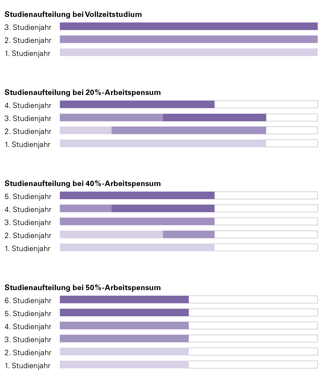 Mit der individuellen Planung kann auf die wechselnden Anforderungen des jeweiligen Arbeitgebers reagiert werden. Die Stundenbelegung an der Hochschule kann über die Studiendauer auch variiert werden. Somit sind wechselnde Teilzeitpensen beim Arbeitgeber während der Studiendauer möglich.