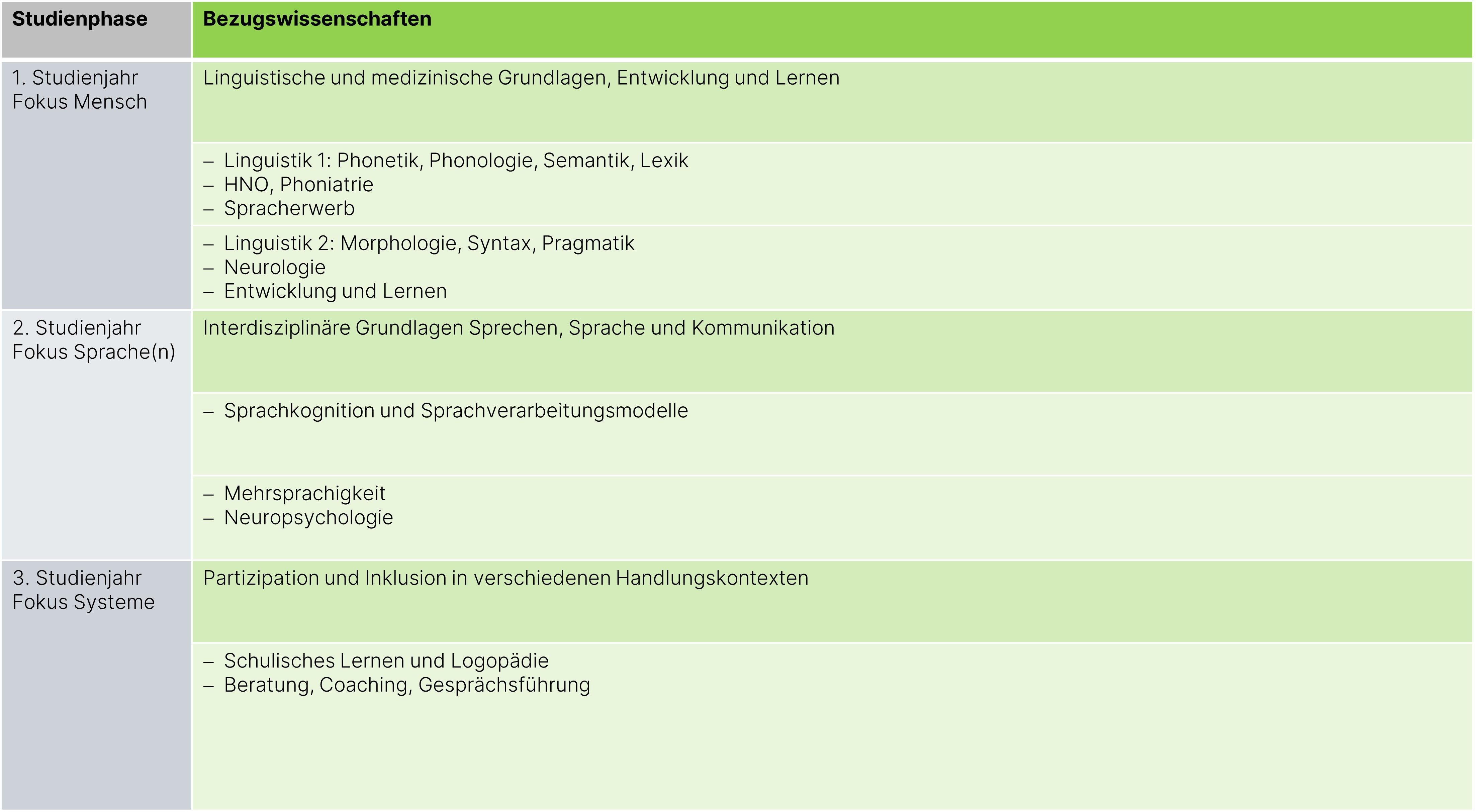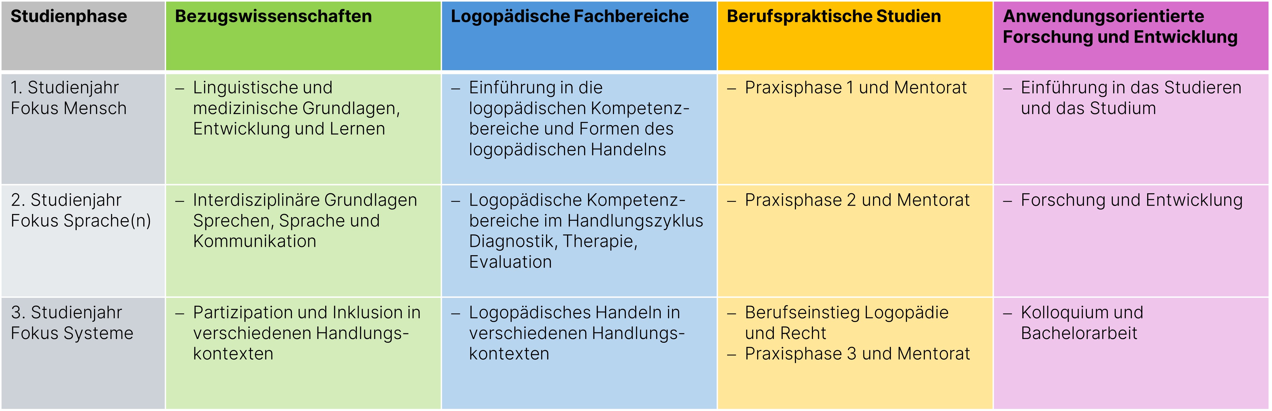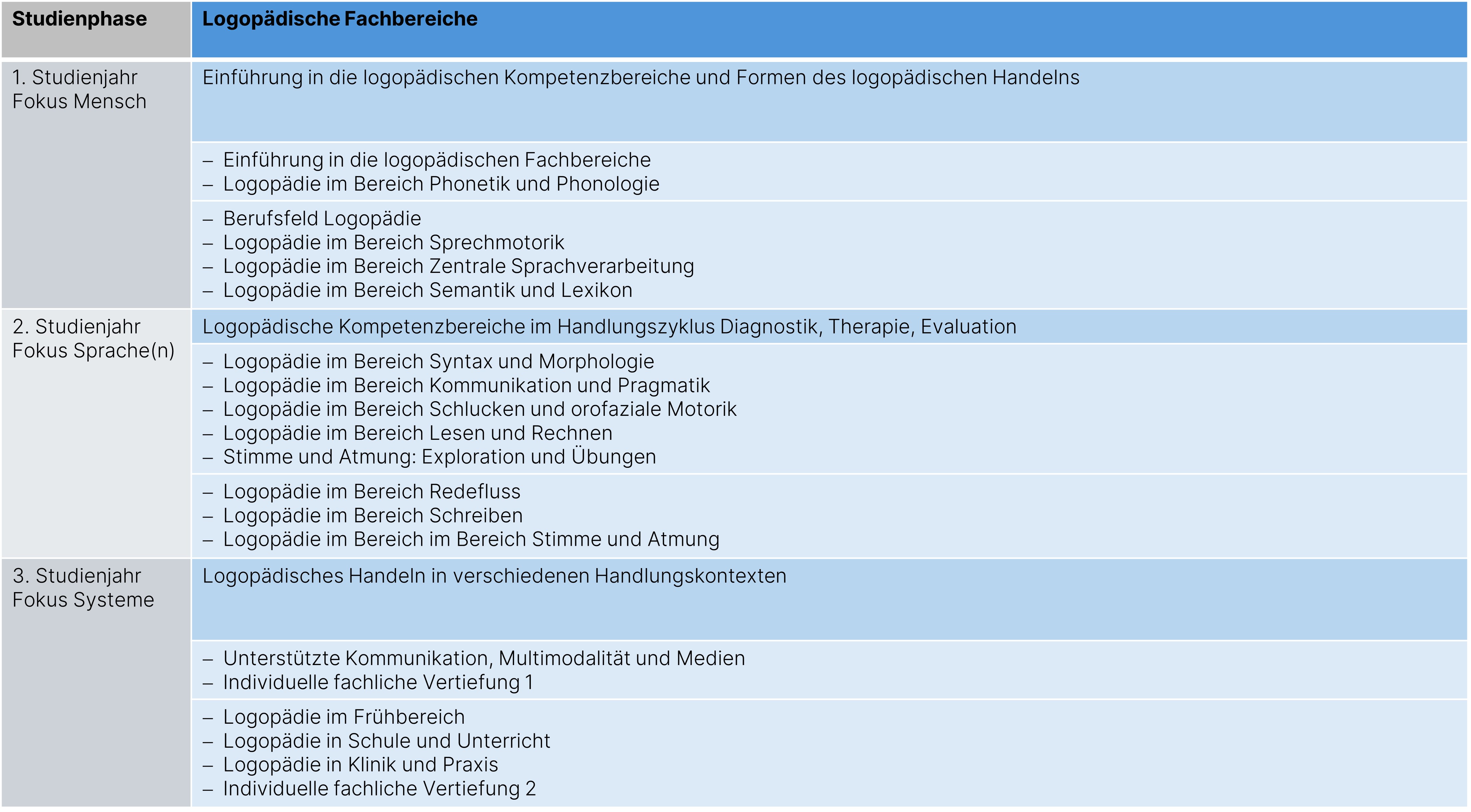 Ihr Logopädie-Studium an der PH FHNW ist modular aufgebaut. Sie erwerben mit jedem Modul spezifische Kompetenzen auf dem Weg zur logopädischen Fachperson. Jedes Modul gehört zu einem bestimmten Studienbereich und ist einem bestimmten Studienjahr zugeteilt. Das Studium bereitet Sie über die modulspezifischen Schwerpunkte aufbauend über die Studienjahre auf die vielfältigen Aufgaben und Verantwortlichkeiten als zukünftige Logopäd*in vor.