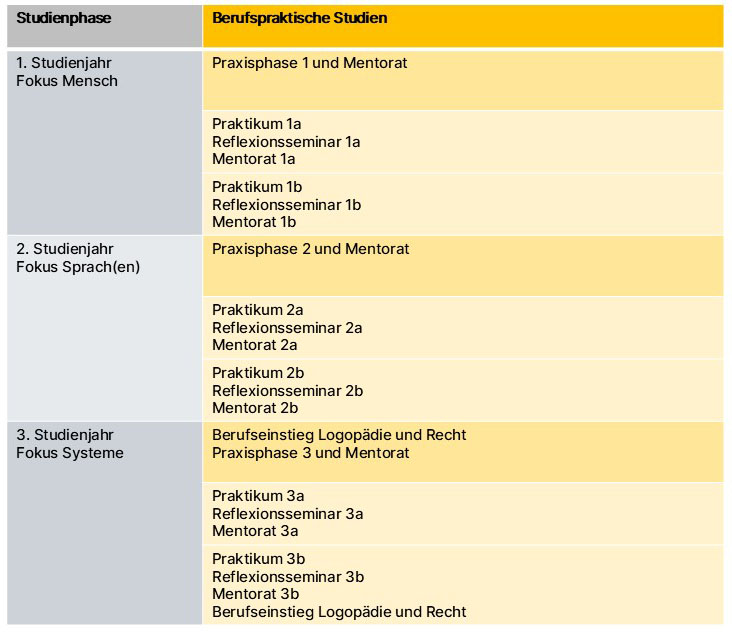 Sie werden von erfahrenen Logopäd*innen ab dem ersten Studiensemester in Praktika begleitet. Ihre Praxiserfahrungen finden in enger Verzahnung mit Modulen an der Hochschule statt. Erfahrungen, Anforderungen oder Fragestellungen aus Ihren Praktika werden wissenschaftlich und reflexiv bearbeitet und die Lernorte Hochschule und Berufsfeld sind systematisch verbunden.