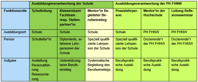 Die Begleitung der Studierenden beim Berufseinstieg wird von Ihrer Schule und der PH FHNW gemeinsam organisiert. Den Studierenden stehen aus Ihrem Schulteam eine Mentoratsperson und eine Praxislehrperson sowie eine oder mehrere erfahrene Lehrpersonen zur Seite (alles in Personalunion möglich).