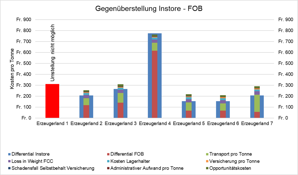 Wie der nachfolgenden Gesamtkostenstruktur entnommen werden kann, ist lediglich eine Kosteneinsparung in Land 4 realisierbar. Aus diesem Grund wird einer Umstellung auf FOB abgeraten. Im Bereich der Lieferkette ab Lagerhalter sowie dessen Standortes lassen sich basierend auf nachfolgenden Varianten wiederum Kosten einsparen.