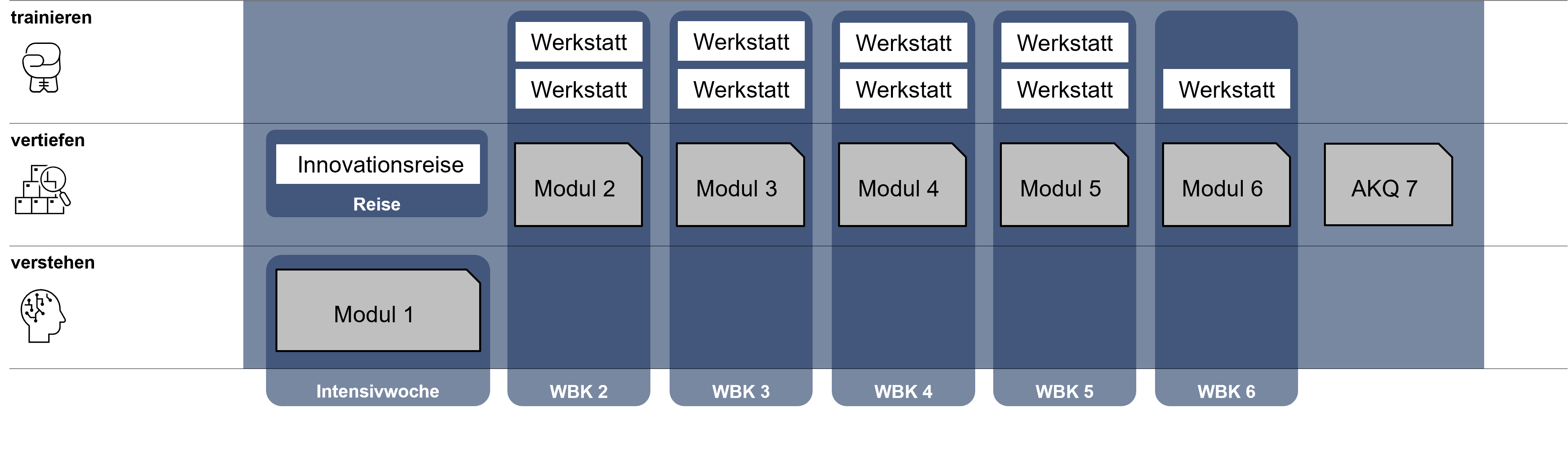 Die Module sind thematisch abgegrenzte Einheiten zur Vertiefung von Inhalten. Diese finden in der Regel über mehrere Tage statt und werden mit Werkstätten zu Trainingszwecken ergänzt. Die Module können zudem als eigenständige Weiterbildungskurse gebucht werden