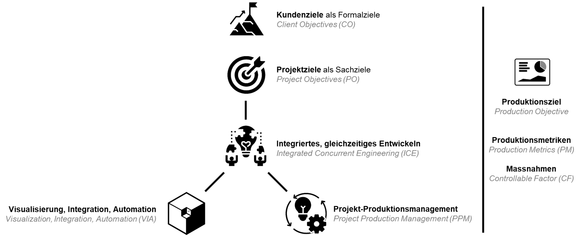 Der Kern von VDC ist die konsequente Ausrichtung von Zusammenarbeitsform (ICE-Sessions), Informationsmanagement (Visualisierung, Integration, Automation) und Prozessgestaltung (Projekt-Produktionsmanamgent) auf Projektziele, die sich aus den Kundenzielen ableiten lassen. Ebenso zentral ist dabei die Messbaerkeit des Projektfortschritts, der sich über sinnvolle Massnahmen und kluge Metriken einstellt.