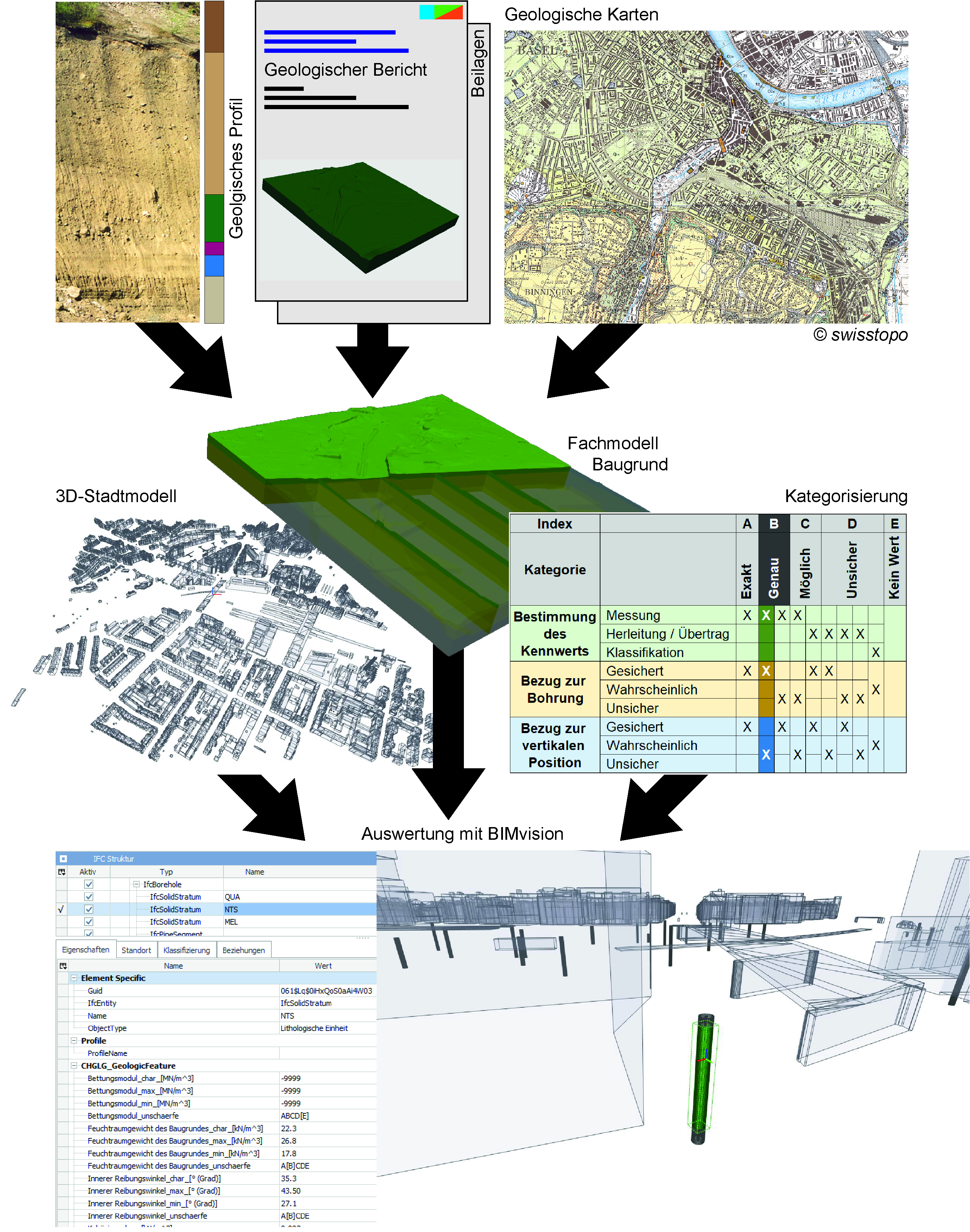 Die Geologie steht seit jeher vor der Herausforderung, dass die Ungenauigkeiten je nach Hintergrund unterschiedliche und uneindeutige Ausprägungen haben können. Die Unschärfen lassen sich kaum quantifizieren, was ihre Vermittlung erschwert. Die Geologie arbeitet daher mit semantischen Informationen und übermittelt diese klassischerweise mit Freitexten. Auf der anderen Seite hat sich für den Ingenieurtiefbau das praxistaugliche Konzept etabliert, den heterogenen Untergrund räumlich in Homogenbereiche einzuteilen und die zugehörigen Materialkennwerte durch charakteristische Werte sowie Minimal- und Maximalwerte zu beschreiben. Damit kann eine statistisch basierte Sicherheitsbemessung eines Bauwerks erstellt werden. Dieses Konzept stellt für die Geologie eine Grundlage dar, um das Problem der Bestimmung der Unsicherheit in Baugrundmodellen für BIM-basierte Planungsprozesse anzugehen. Die Bereitstellung von Freitexten oder Darstellungen mit grafischer Diffusion wird als wenig wirksam gewertet, da sie bei grosser Datenmenge kaum beachtet werden und aufgrund ihrer Uneindeutigkeit kaum Aussagekraft haben.